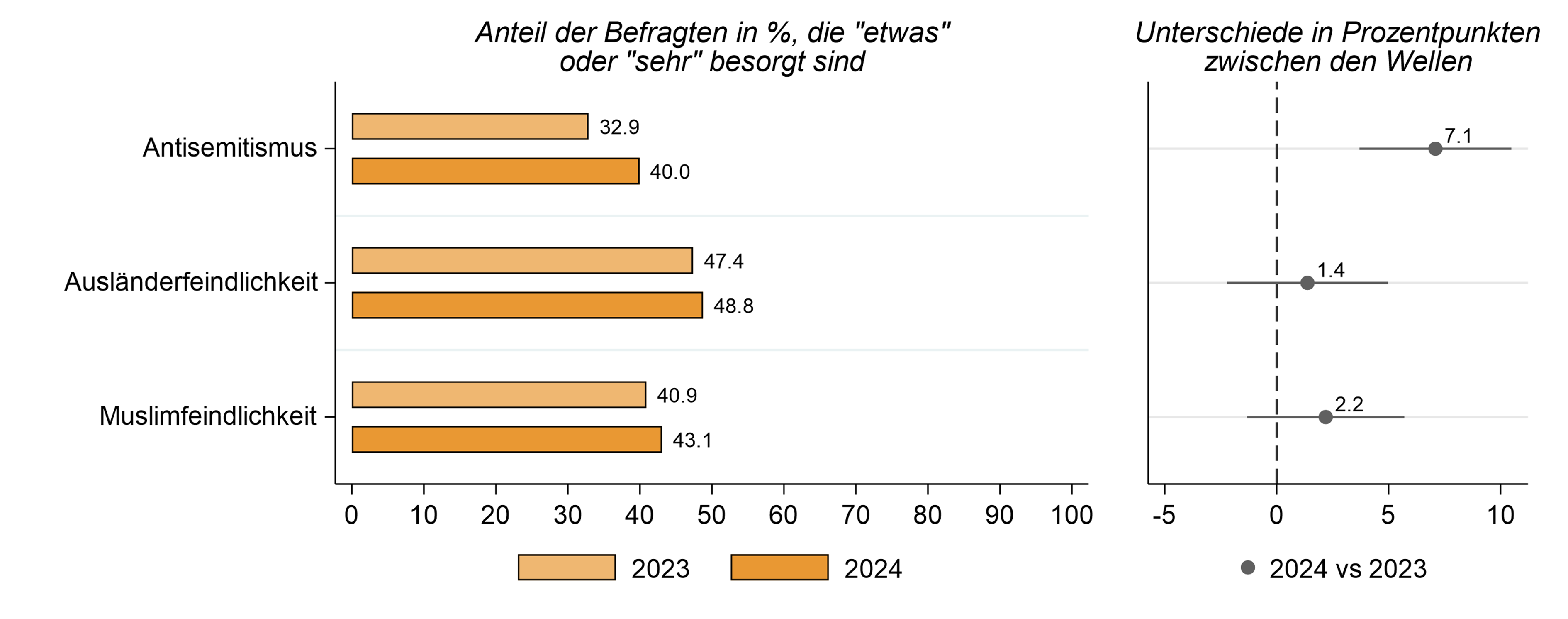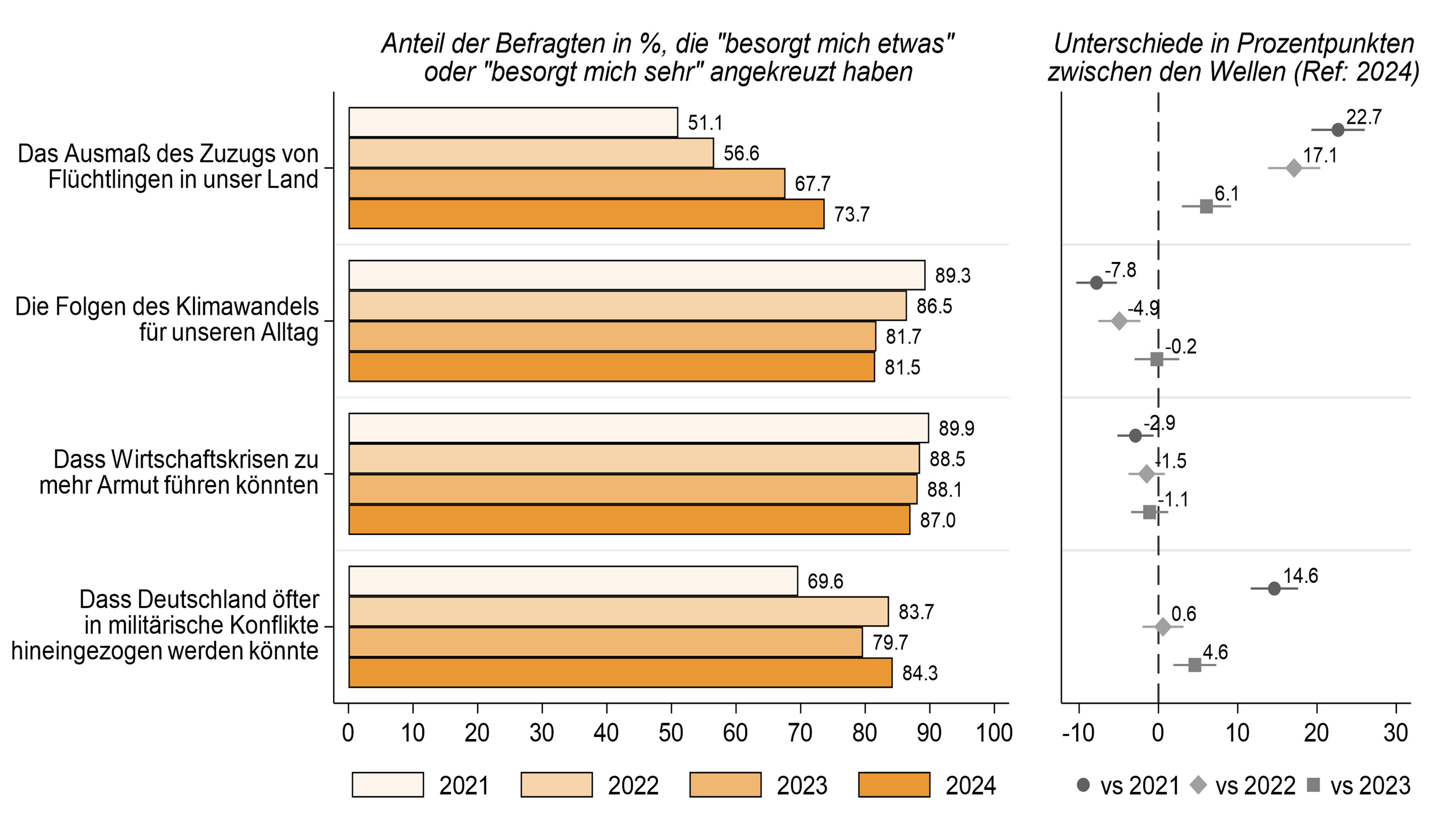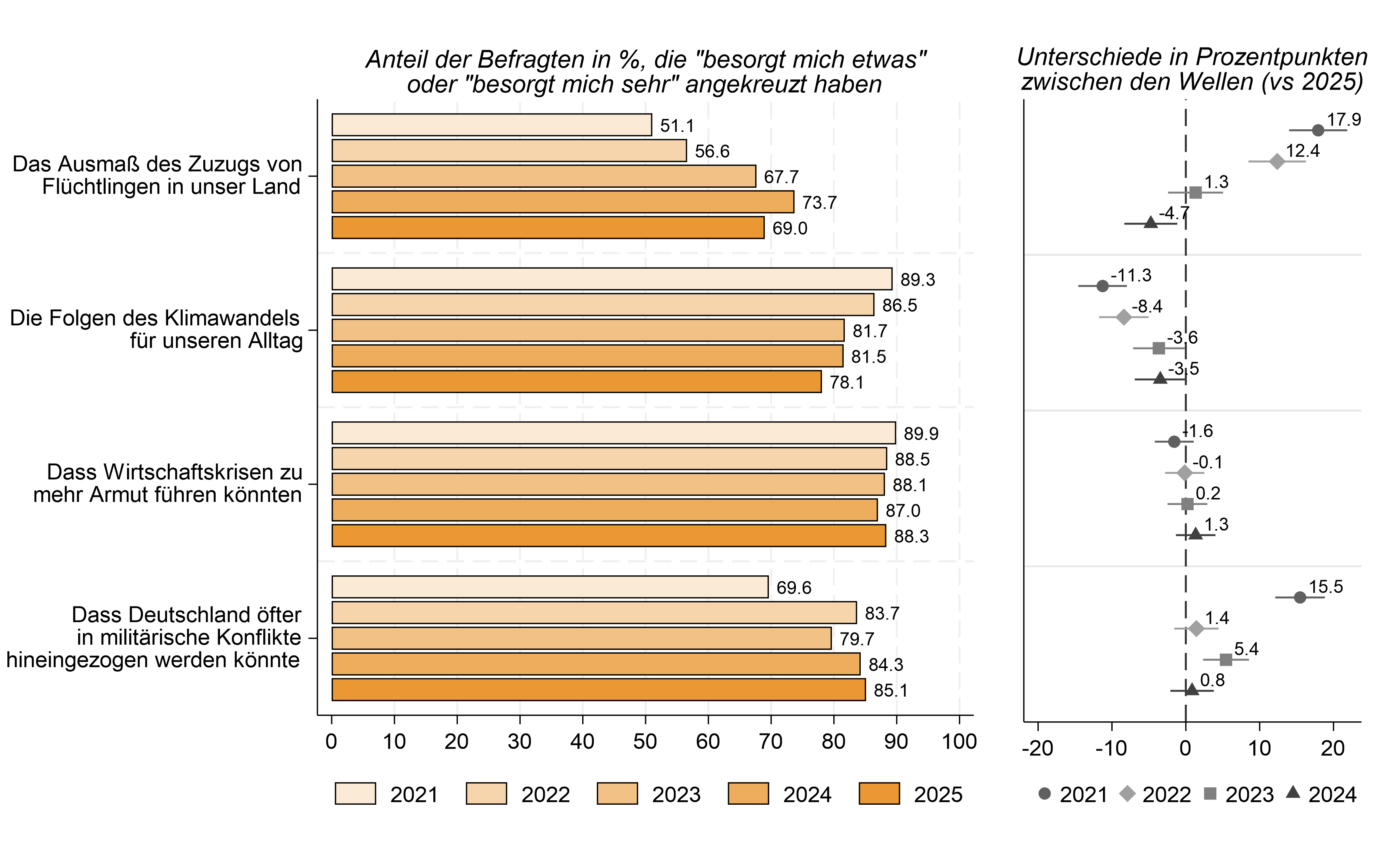 Sorgen in Bezug auf das Thema Flüchtlingszuwanderung und Krieg haben im Vergleich zu den Vorjahren deutlich zugenommen. Die Anteile derer, die darüber „etwas“ oder „sehr“ besorgt sind, sind seit 2021 um 17.9 (Zuzug geflüchteter Menschen) bzw. 15.5 Prozentpunkte (dass Deutschland in militärische Konflikte hineingezogen werden könnte) gestiegen. Demgegenüber bleiben die Raten derer, die zumindest etwas Besorgnisse wegen des Klimawandels äußern, mit über achtzig Prozent zwar weiterhin hoch, haben aber seit 2021 um 11.3 Prozentpunkte abgenommen. Die Verbreitung von Sorgen im Hinblick auf wachsende Armut aufgrund von Wirtschaftskrisen in Deutschland aufgrund von Wirtschaftskrisen haben sich kaum verändert. Sie liegen 2025 allerdings bei 88.3% und damit unverändert weiterhin recht hoch.