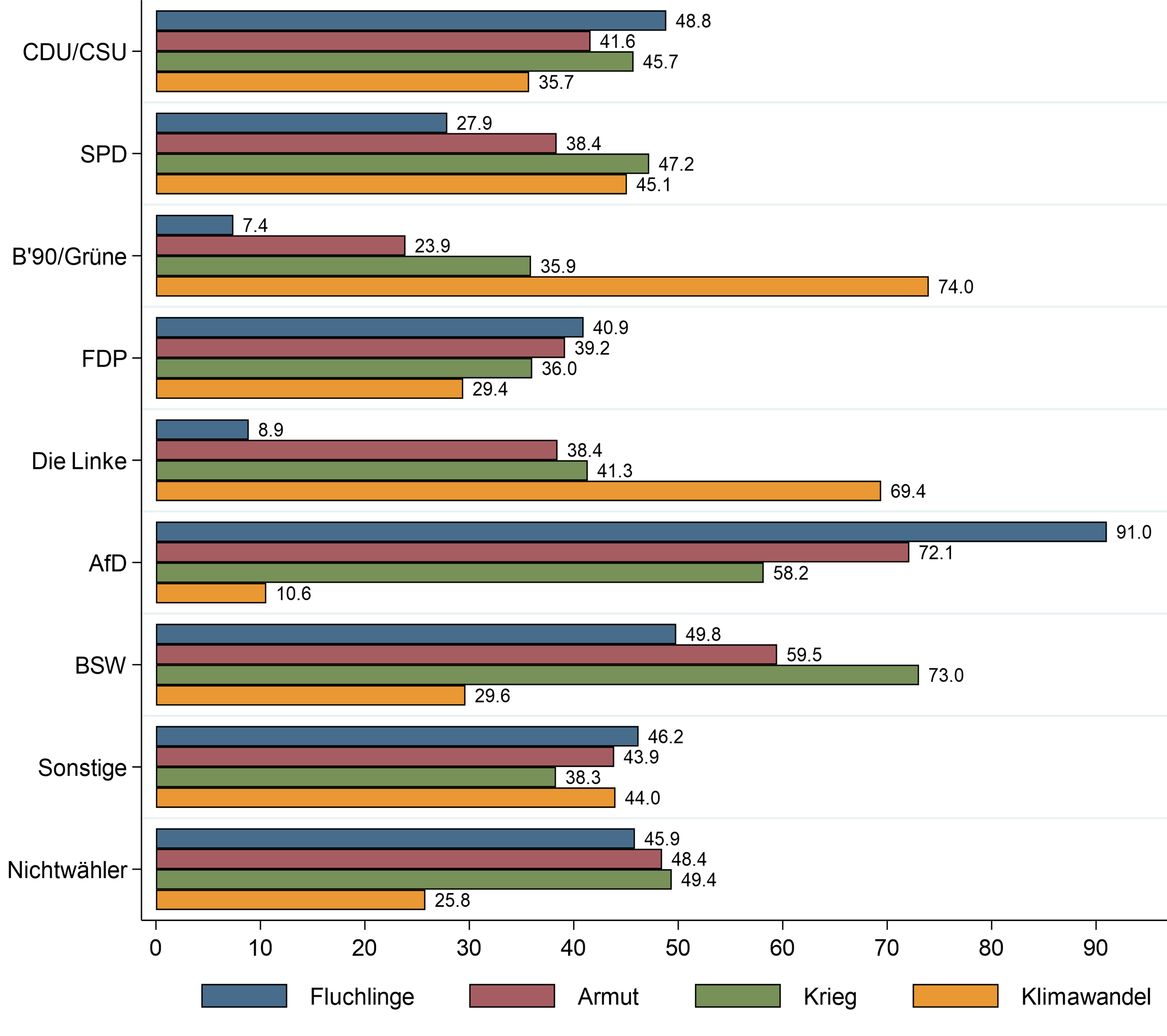 Bei Bündnis90/Grüne sowie der Linken und der SPD dominiert demgegenüber der Klimawandel mit Spitzenwerten der Besorgnisraten.