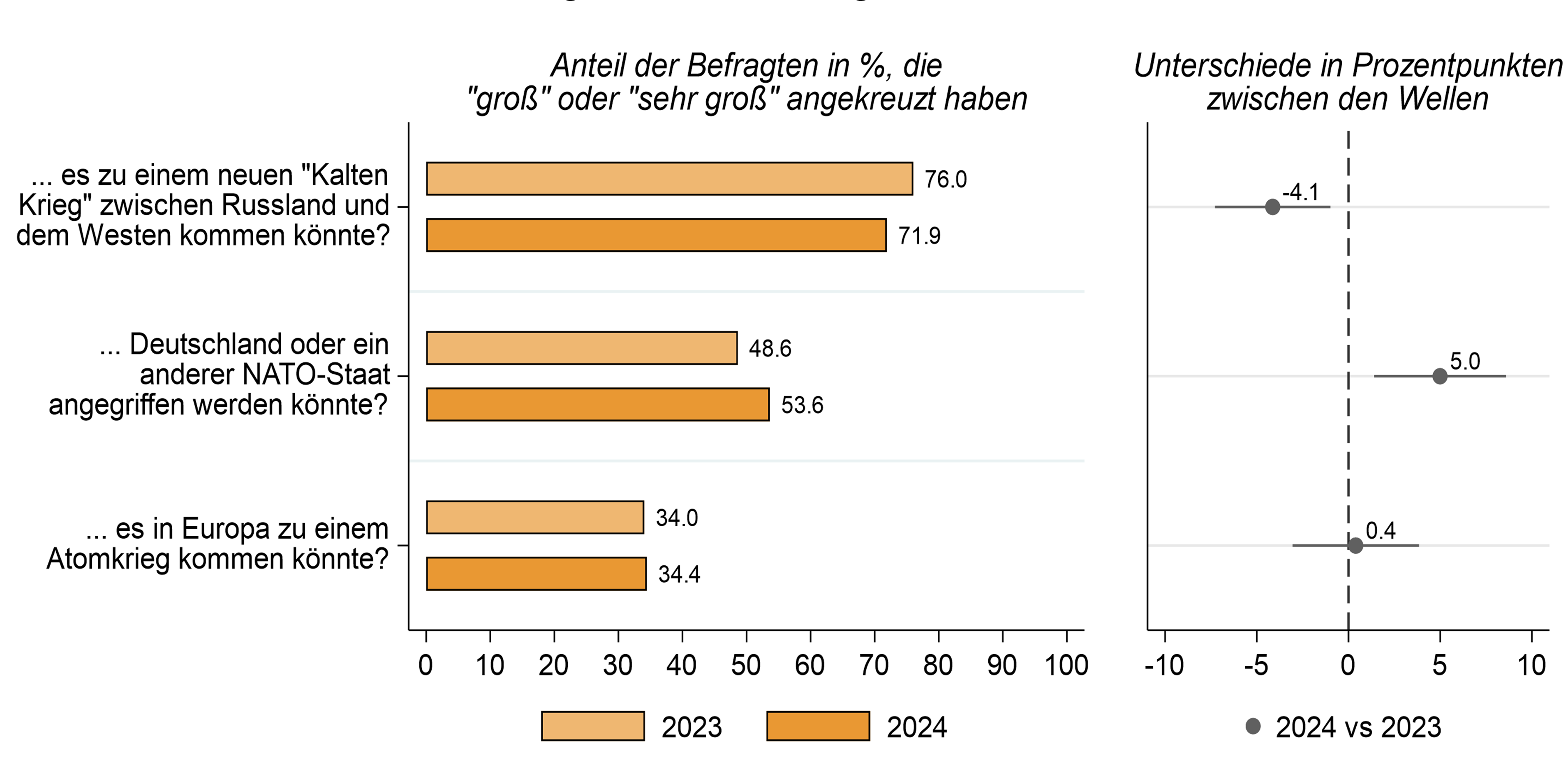 Abbildung 3: Verbreitung „großer“ oder „sehr großer“ spezifisch kriegsbezogener Besorgnisse (Angaben in %; MiD 2023-2025; gewichtete Daten)