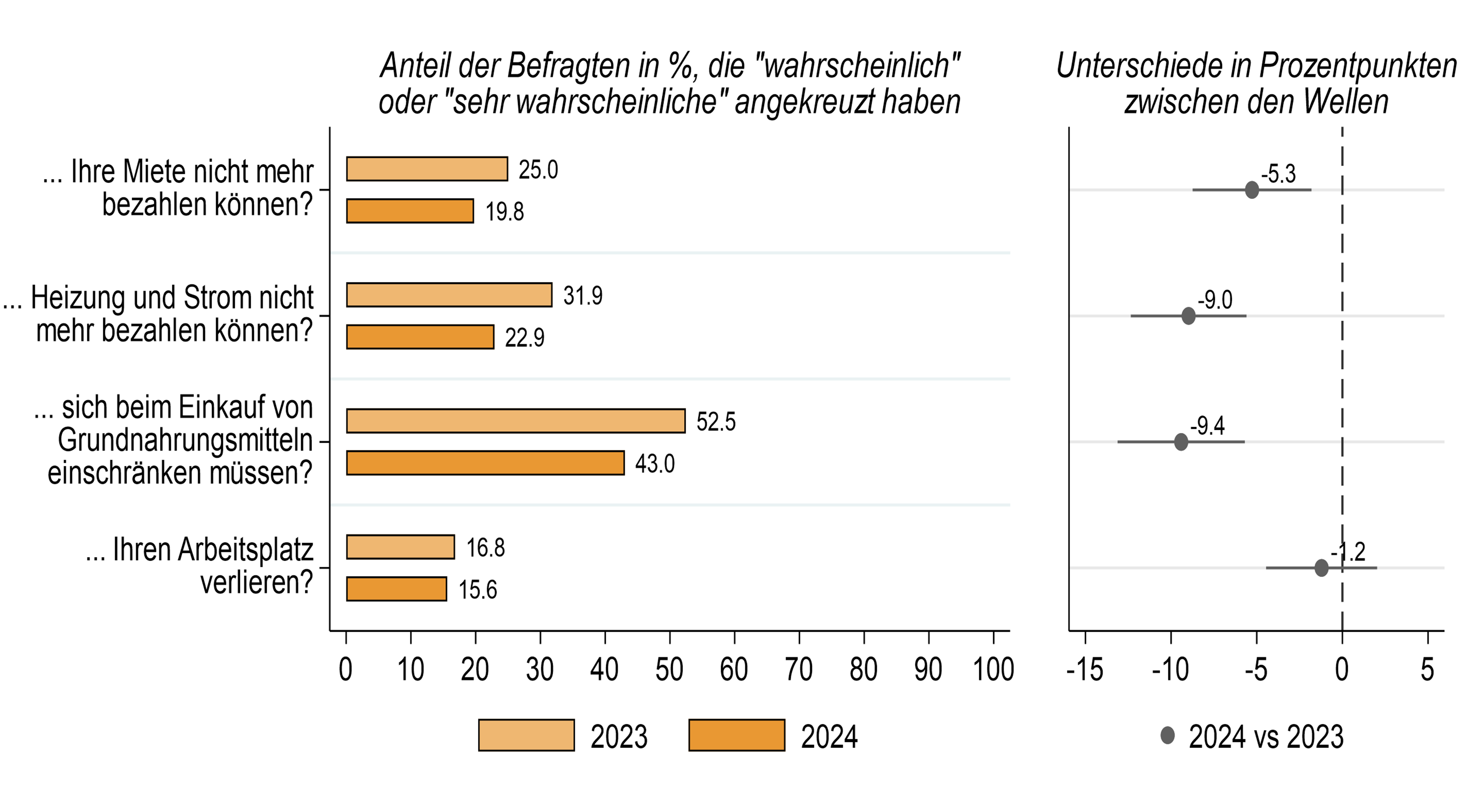 In einer Gesamtschau sind somit seit 2023 die subjektiv befürchteten ökonomischen Einschränkungen und Belastungen überwiegend nicht gestiegen; in einigen Bereichen sind sogar Verbesserungen zu erkennen. Ein Niveau von etwa einem Fünftel der Menschen, die glauben demnächst Mieter und Strom nicht mehr bezahlen zu können, ist aber gleichwohl als relativ hoch einzustufen. Dies gilt erst recht, wenn man betrachtet, dass mehr als ein Drittel sich im Bereich der Versorgung mit Grundnahrungsmittel glaubt einschränken zu müssen.