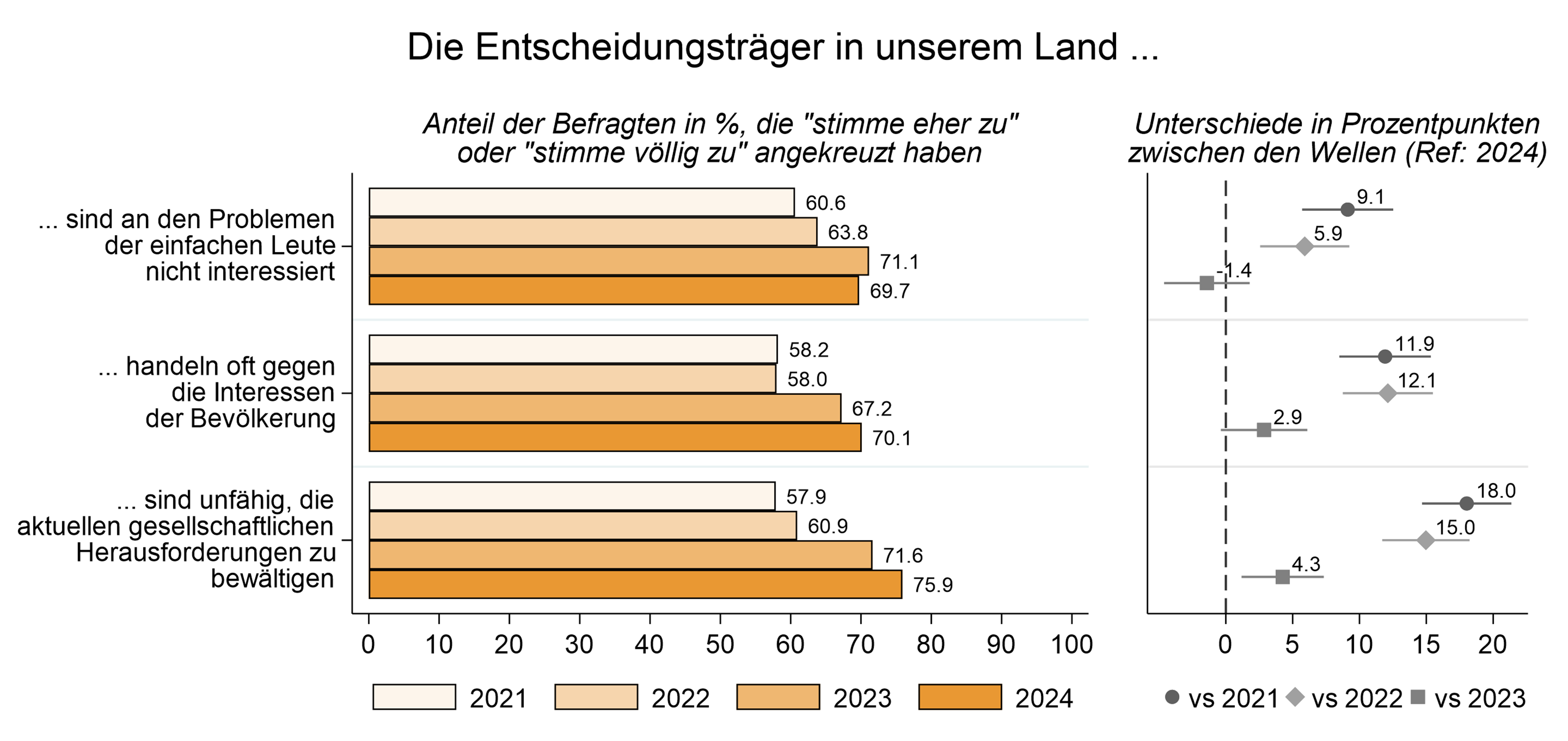 2025 stimmen 70.5% der Aussage zu, dass die gesellschaftlichen Entscheidungsträger aus Wirtschaft, Wissenschaft und Politik sich nicht für die Probleme der einfachen Leute interessieren. 64.4% glauben, dass die gesellschaftlichen Führungskräfte oft gegen die Interessen der Bevölkerung handeln. 72.0% sind zudem der Ansicht, die Verantwortlichen seien gar nicht in der Lage, die aktuellen gesellschaftlichen Herausforderungen erfolgreich zu bewältigen (vgl. Abbildung 5).