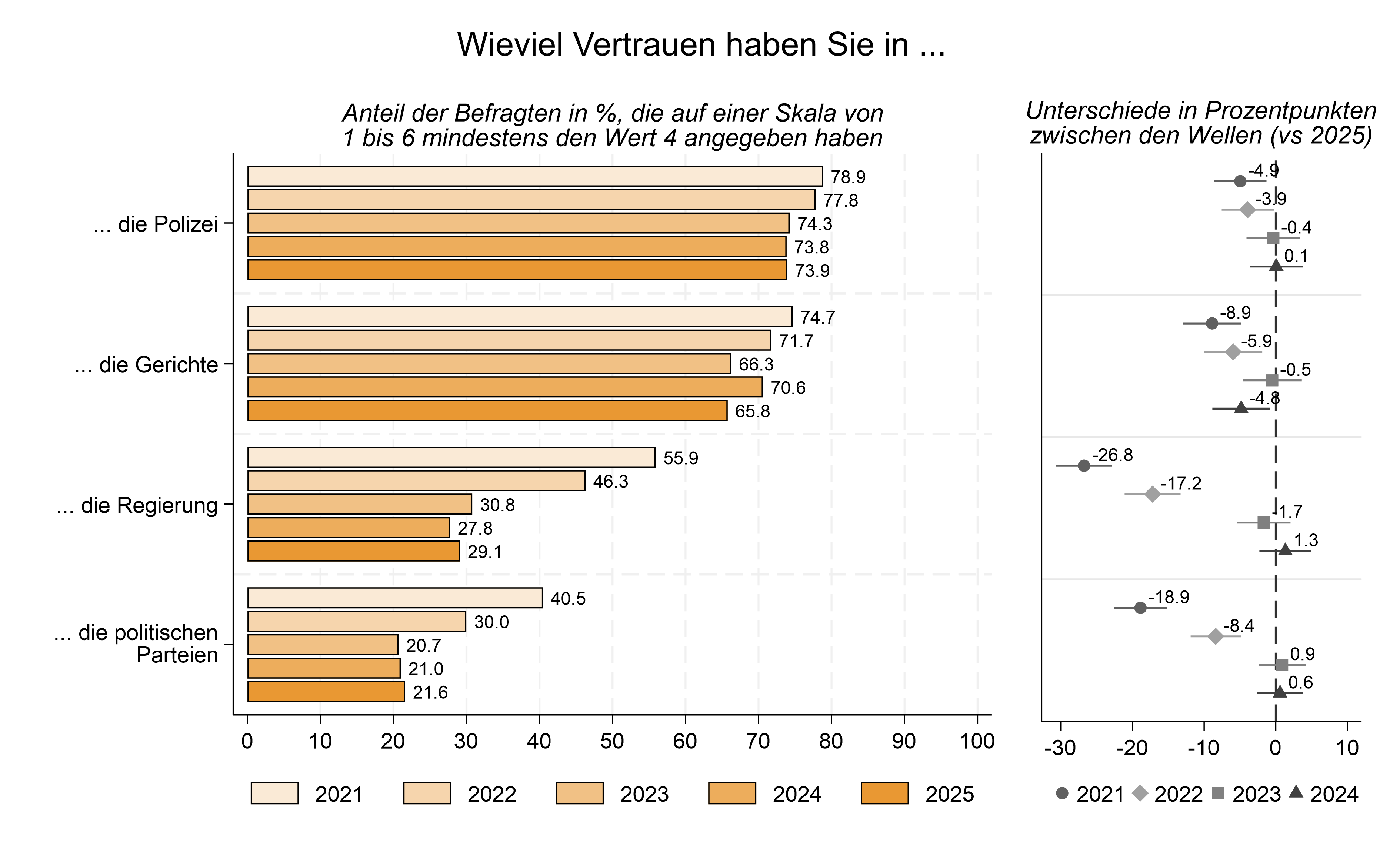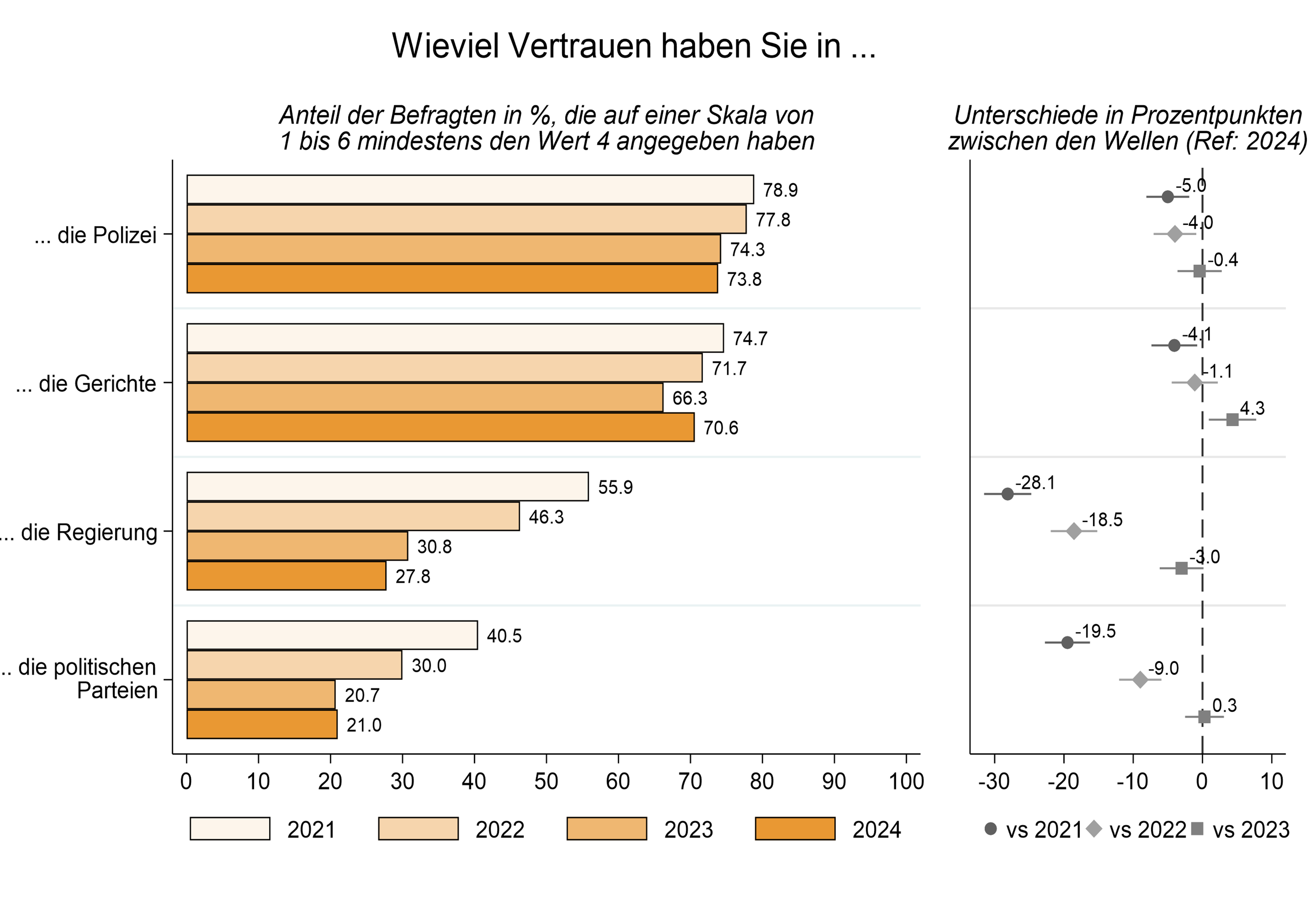 Im Einklang damit zeigen sich seit 2021 auch ganz erhebliche Rückgänge des Vertrauens der Bürger*innen, die vor allem Regierung und Parteien, also die Politik betreffen. Dieser Trend ist, wenn auch etwas schwächer ausgeprägt, mit Blick auf staatliche Institutionen wie Polizei und Gerichtsbarkeit ebenfalls zu finden (vgl. Abbildung 6).