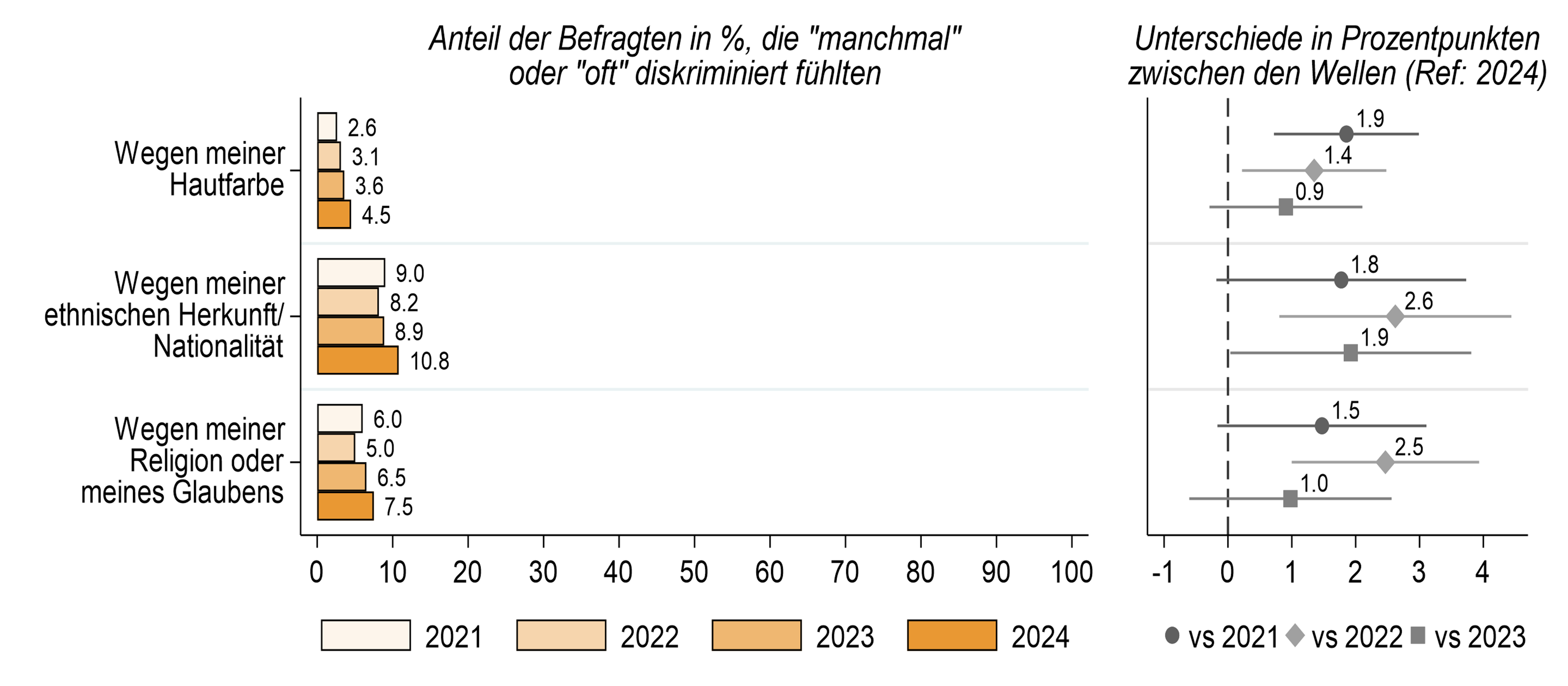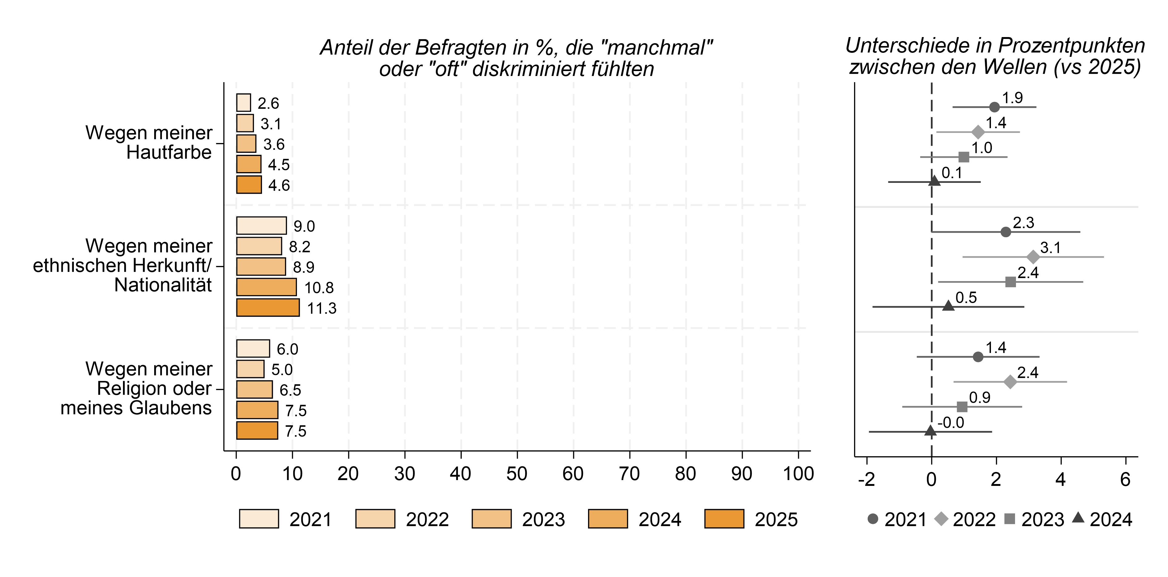 Aufgrund ihrer Hautfarbe wurden 4.6% der Befragten des Jahres 2025 in den letzten 12 Monaten „manchmal“ oder „oft“ diskriminiert. Dieser Anteil ist seit 2021 um 2.0 Prozentpunkte signifikant angestiegen. Wegen ihrer ethnischen Herkunft oder Nationalität fühlten sich 11.3% der Befragten 2025 diskriminiert. Auch diese Rate ist im Vergleich zu den Vorjahren gestiegen und aktuell auf dem höchsten Niveau. Unter Bezug auf ihre Religion diskriminiert wurden 2025 nach eigenen Angaben 7.5%. Auch diese Rate ist höher als 2021 und liegt 2024 und 2025 am höchsten.