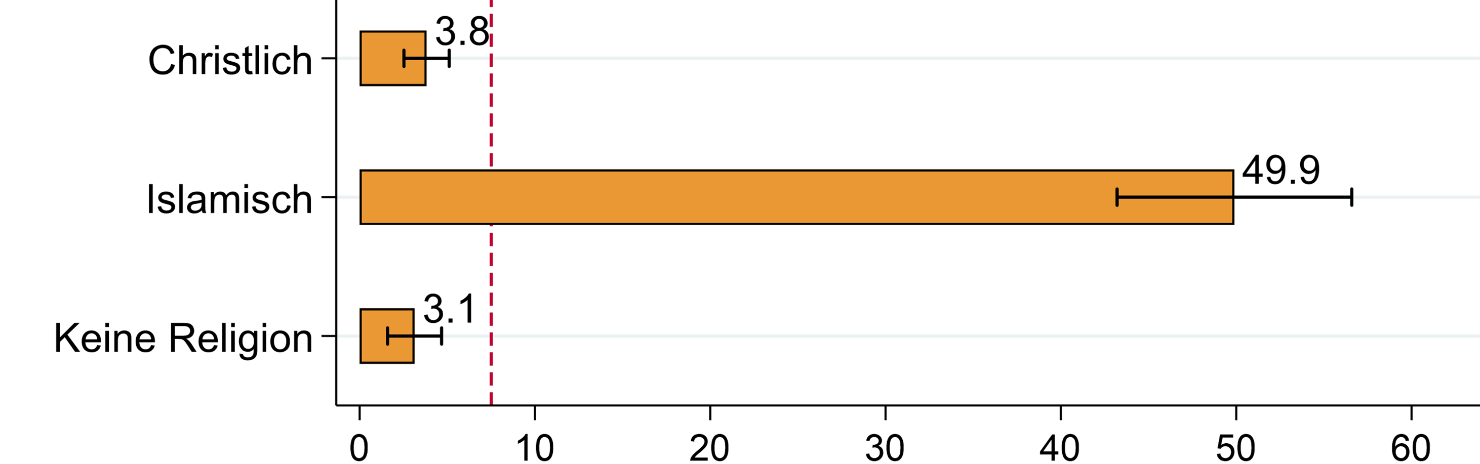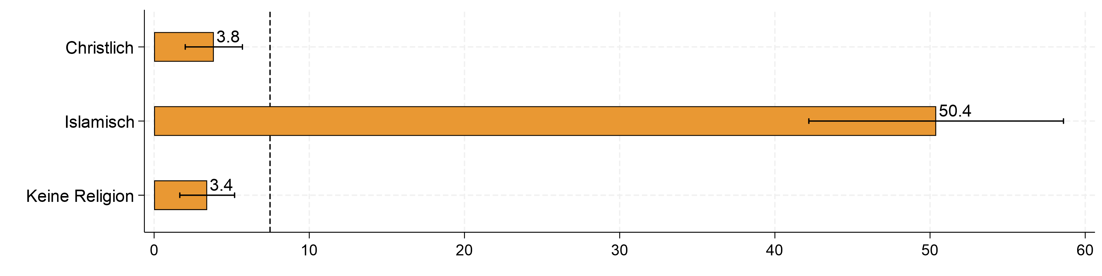 Abbildung 9: Prozent der Personen, die in den letzten 12 Monaten von Diskriminierung wegen ihrer Religion betroffen waren nach Art der Religionszugehörigkeit (% „manchmal“ oder „oft“ wegen Religion diskriminiert gefühlt; MiD 2025; gewichtete Daten)
