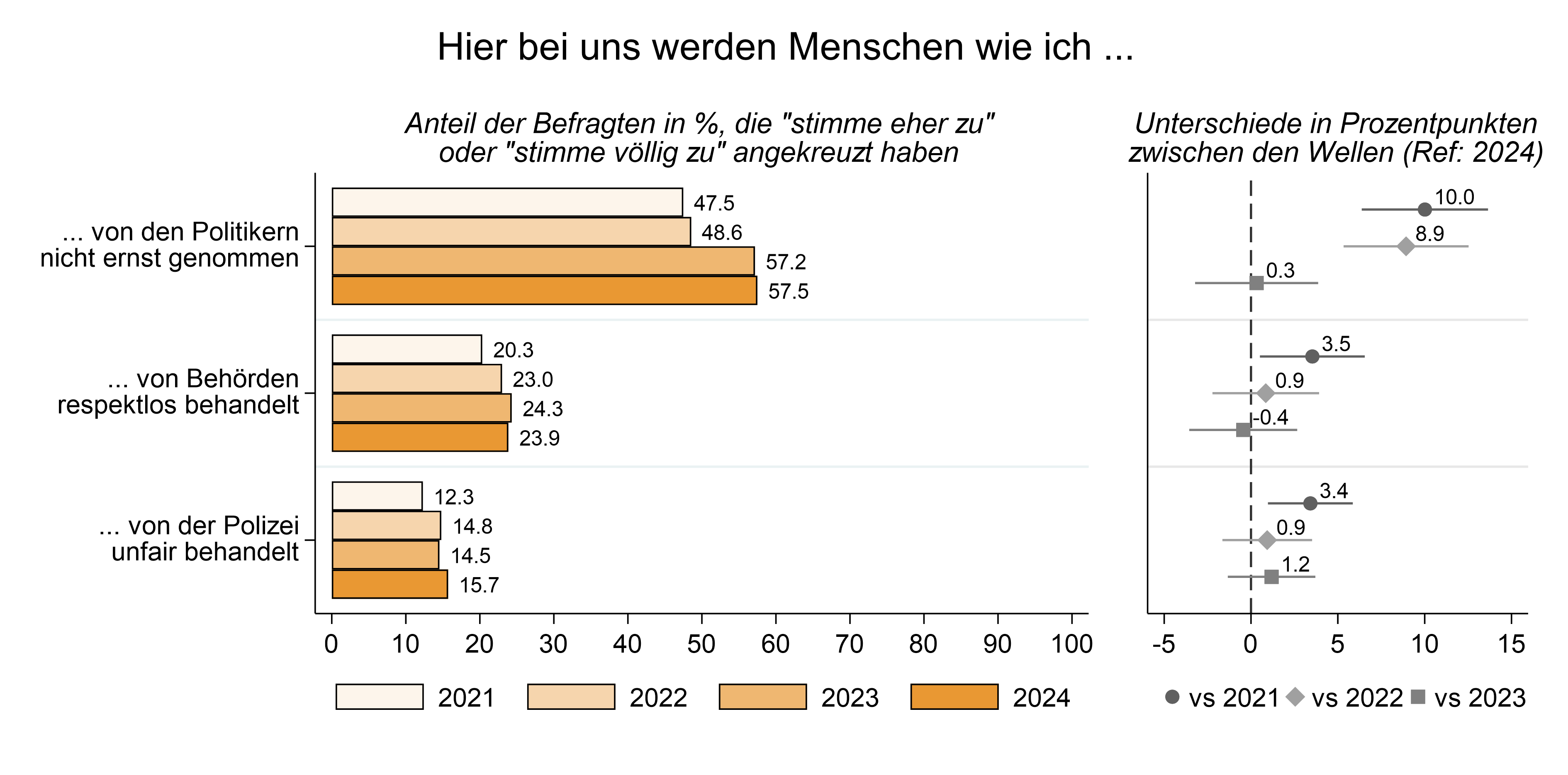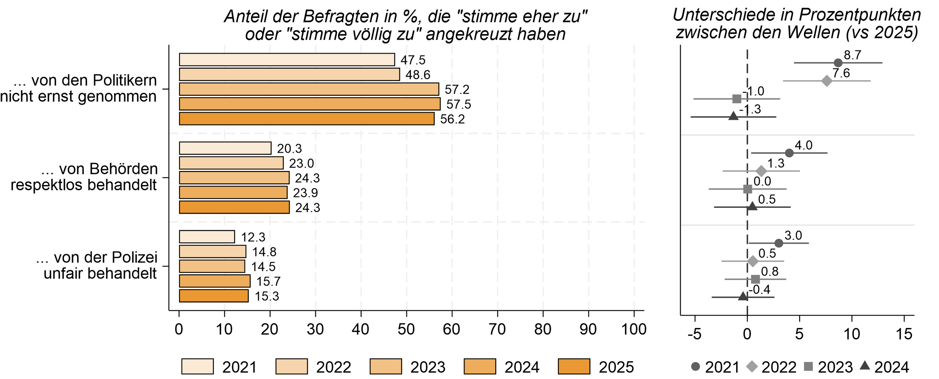 Mehr als die Hälfte der Befragten teilt die Meinung, dass Menschen wie sie selbst von der Politik nicht richtig gesehen bzw. nicht ernst genommen werden. 20.3% stimmten 2021 der Aussage zu, dass die Behörden Menschen wie sie respektlos behandeln. 2025 sind dies 24.3%, was einer signifikanten Zunahme von 3.5 Prozentpunkten entspricht und den bisherigen Höchststand im betrachteten Gesamtzeitraum markiert.