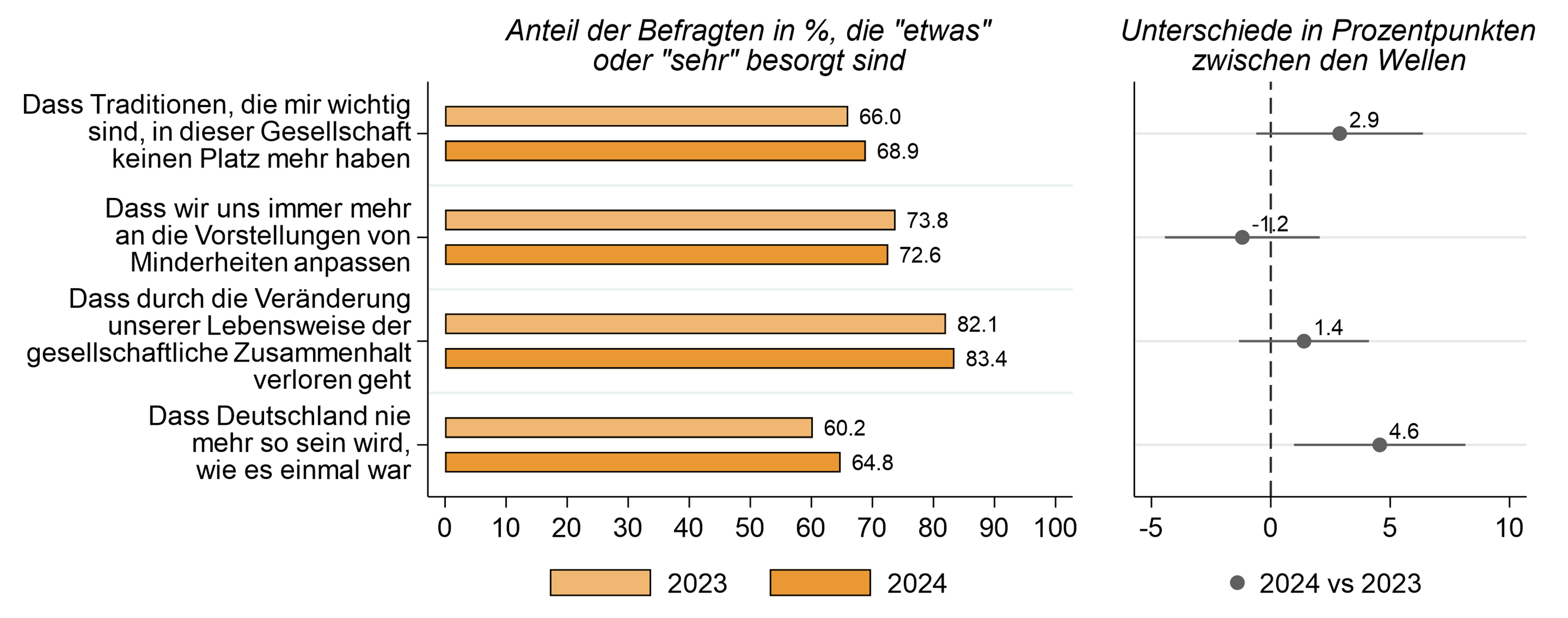 So werden von der überwiegenden Mehrheit starke Befürchtungen aufgrund kultureller Veränderungen und gesellschaftlichen Wandels geäußert (zwischen 61.9% und 84.8%). Diese betreffen „Verlust von Traditionen ", Entwicklungen im Sinne einer zunehmenden Anpassung an Werte bzw. „Vorstellungen von Minderheiten " sowie die Sorge, dass der „gesellschaftliche Zusammenhalt " aufgrund der Veränderungen der Lebensweise verloren geht und Deutschland nicht mehr so sein wird „ wie es einmal war “.
