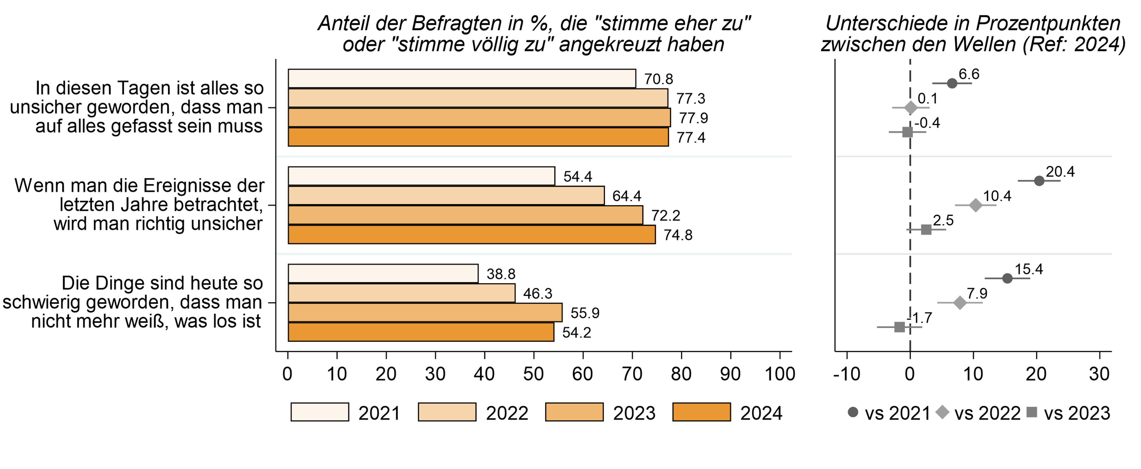 Insgesamt haben damit im Vergleich zum Vorjahr alle Aussagen mehr Zustimmung erhalten. Aktuelle Krisen und Veränderungen, die sich zwischen den beiden Befragungen ereignet haben, lösen demnach eine zum Teil deutlich erhöhte allgemeine Verunsicherung aus, die zusammengenommen mehr als die Hälfte der Bevölkerung betrifft.