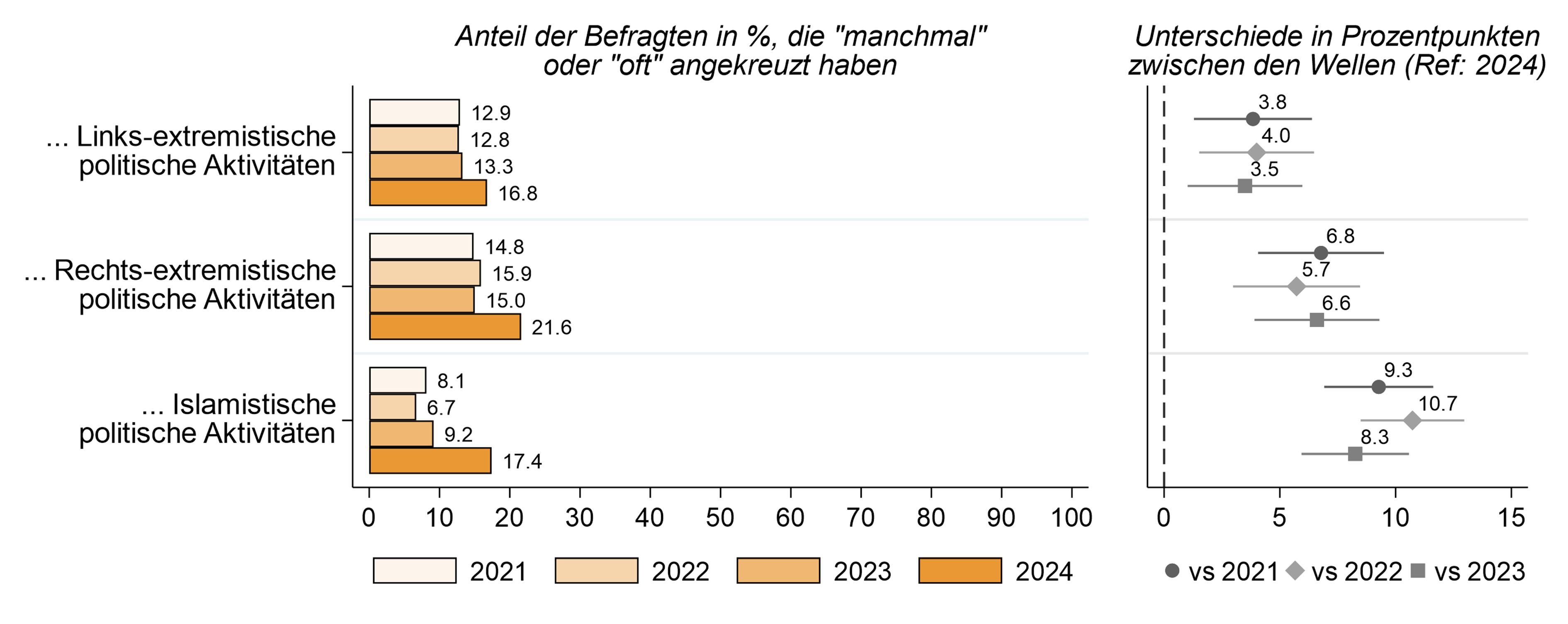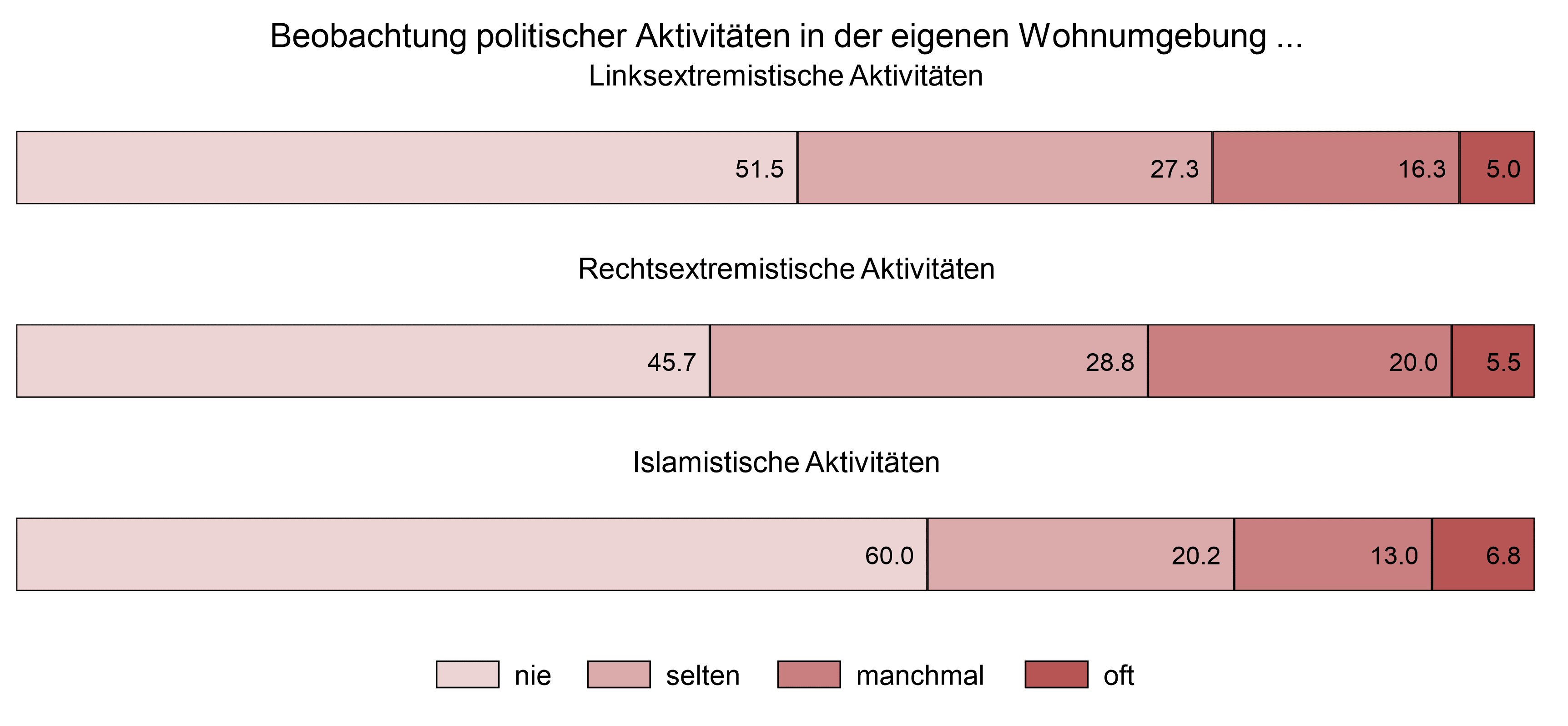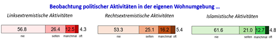 Die Befragten wurden darüber hinaus auch zu ihren Wahrnehmungen und Beobachtungen verschiedener politischer Extremismen – in Form von linksextremistischen, rechtsextremistischen und islamistischen Aktivitäten – im eigenen Lebensumfeld befragt.