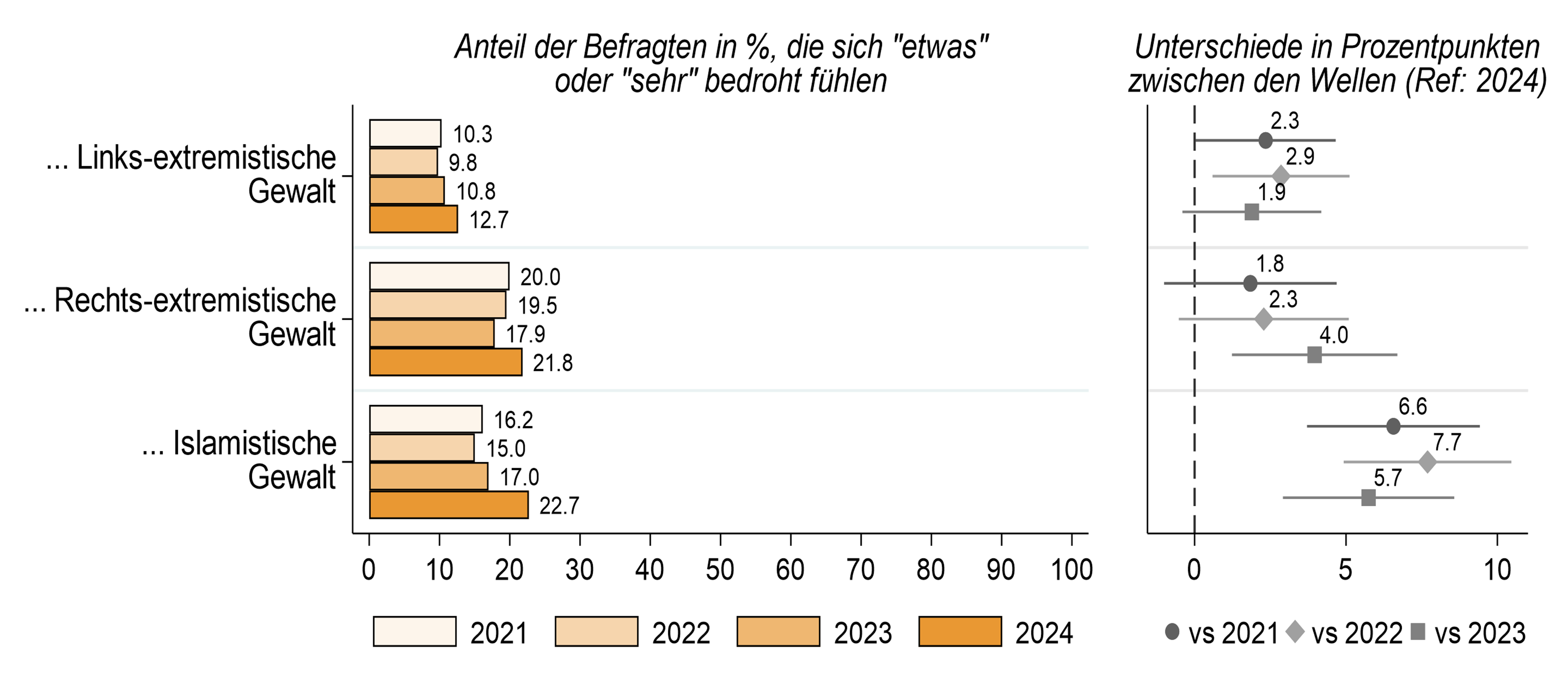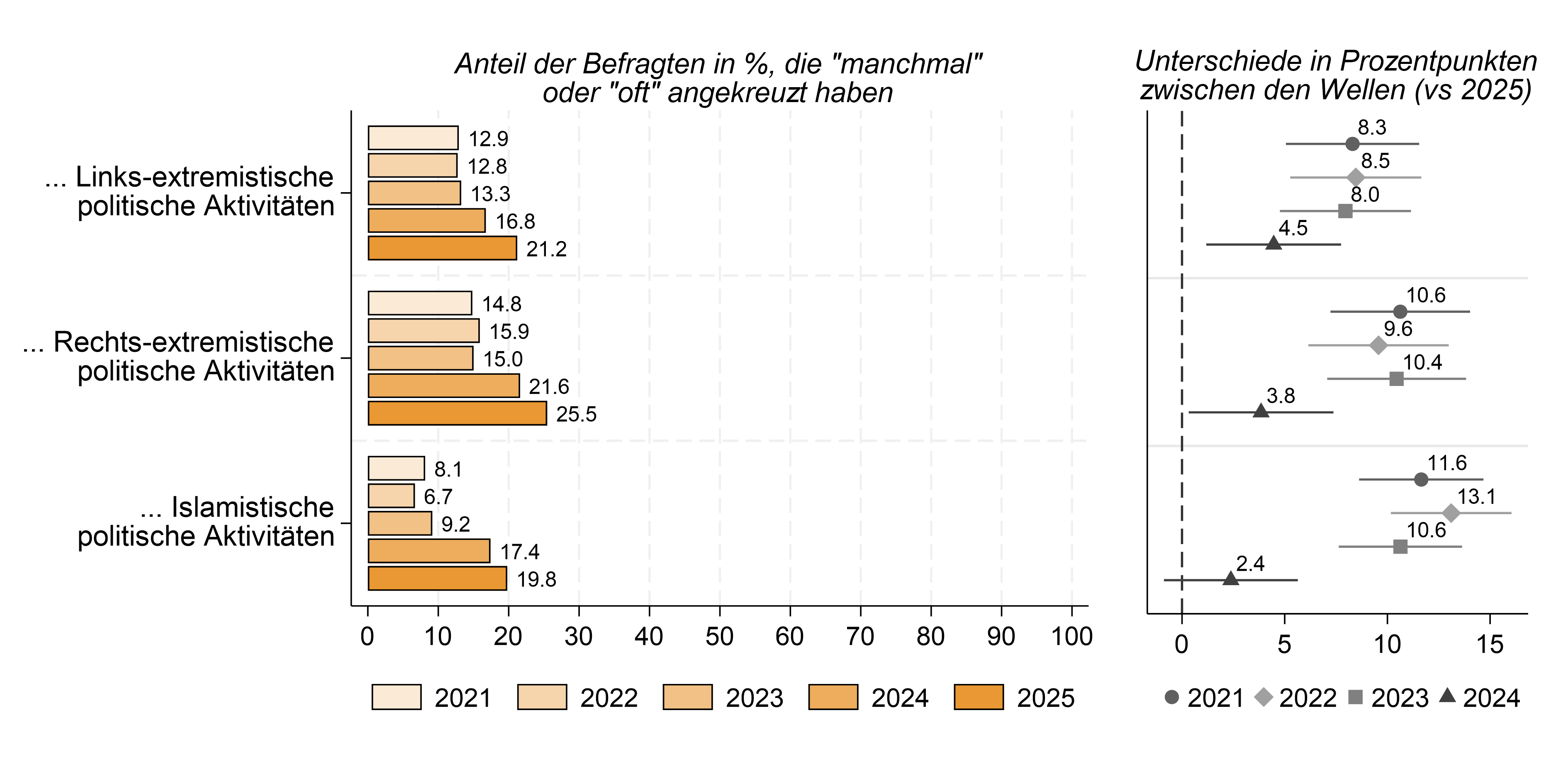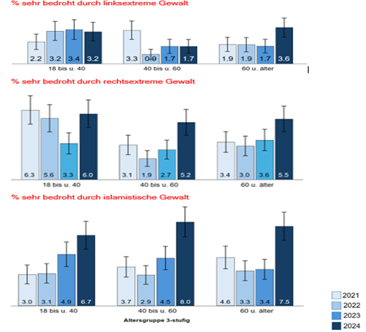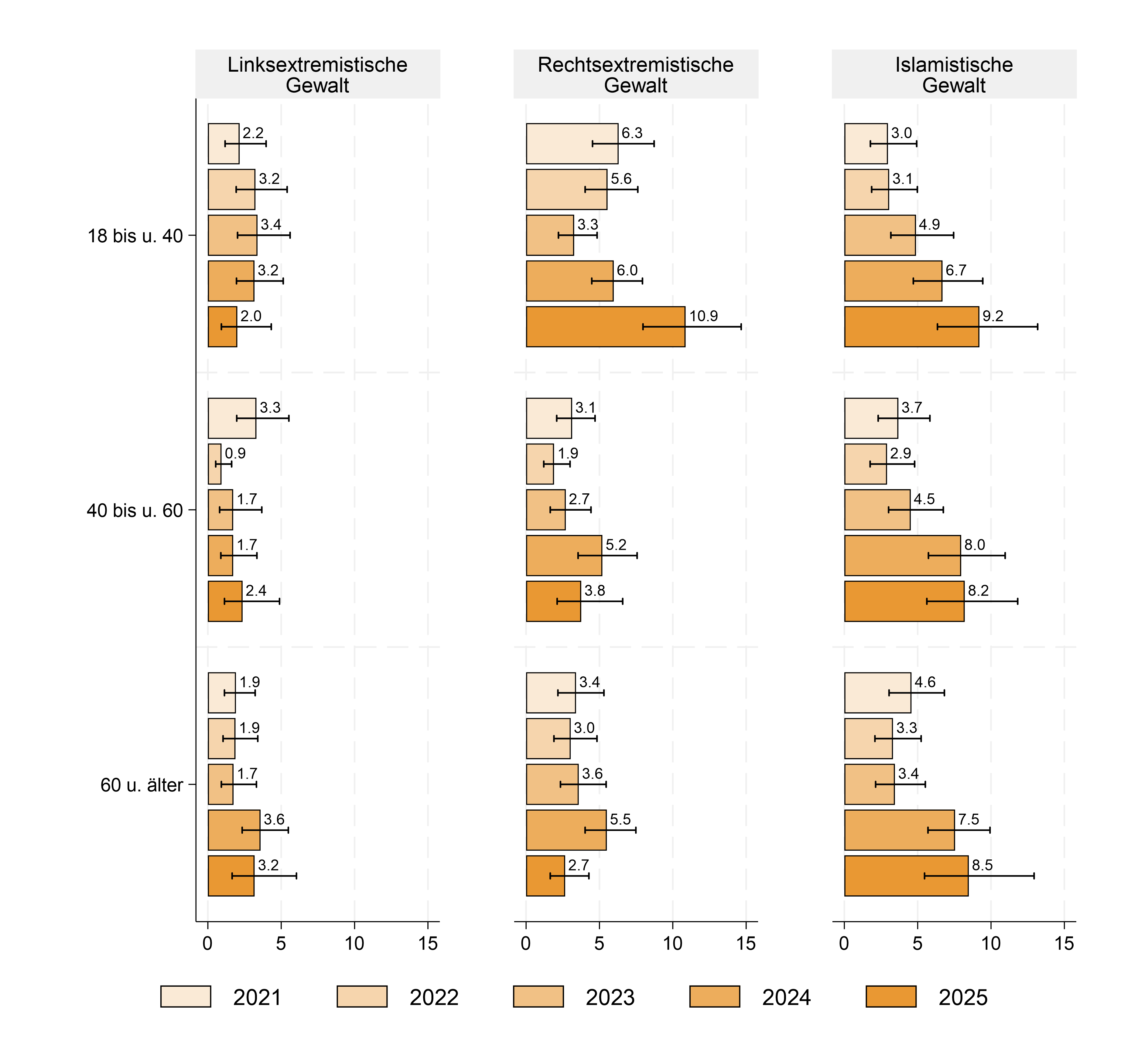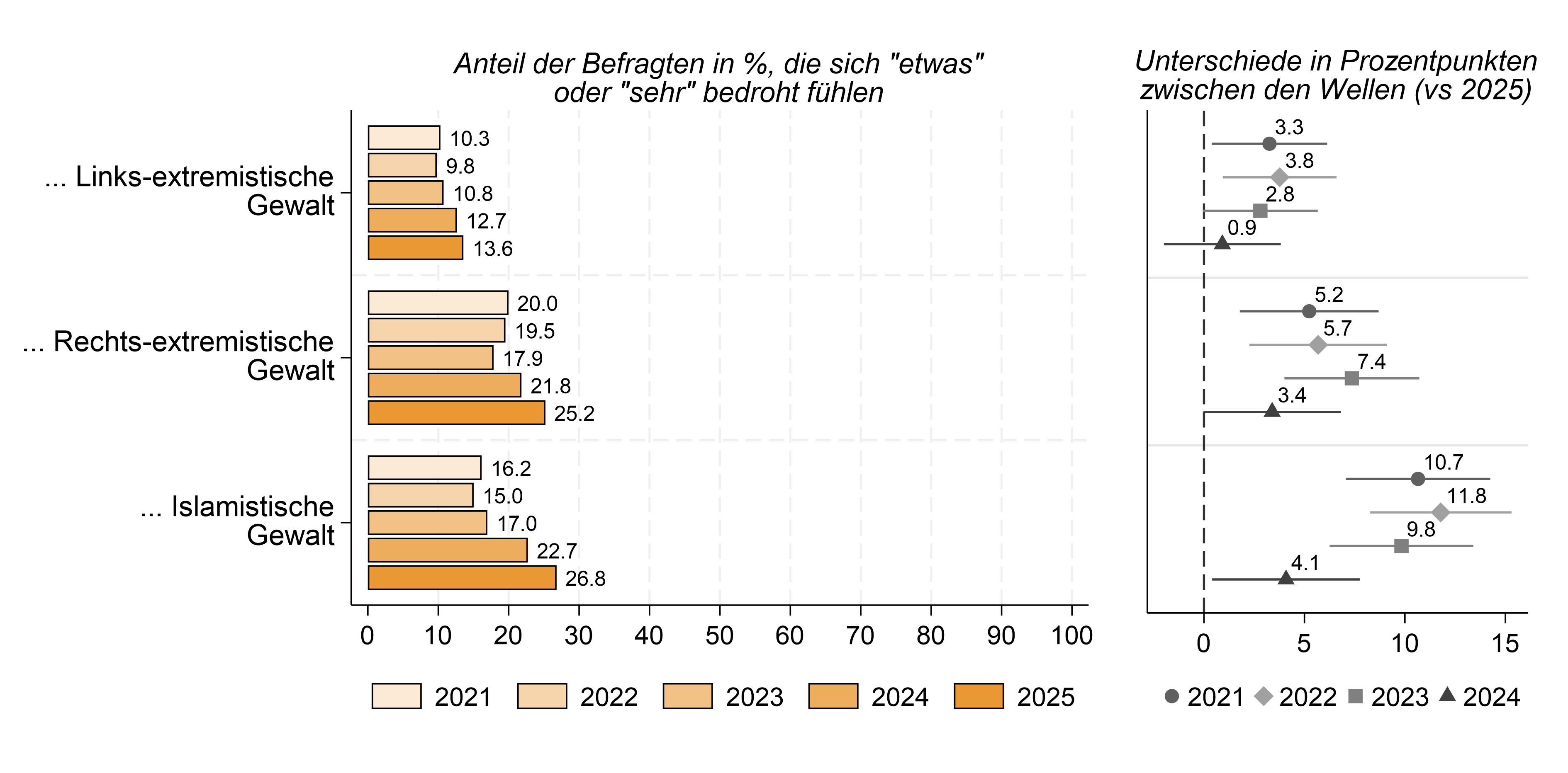 So geben 8.6% der Befragten 2025 an, sich durch islamistische Gewalt sehr bedroht zu fühlen, was in Relation zu 2021 mehr als eine Verdopplung bedeutet. Für Rechtsextremismus ist zwar auch eine solche Tendenz der Zunahme starker Bedrohungsgefühle erkennbar, aber die Anstiege sind hier nicht so stark. Bis 2022 war interessanterweise die Intensität der erlebten Bedrohung durch Rechtsextremismus deutlich stärker, als das für Islamismus gilt. Das ist 2025 umgekehrt.
