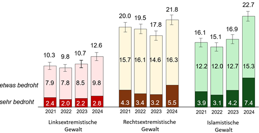 Die Beobachtungen der Befragten in deren eigenen Lebensumfeldern verweisen im Einklang damit auf Symptome eines reduzierten gesellschaftlichen Zusammenhalts und wachsender Radikalisierung in unterschiedlichen ideologischen Bereichen. Subjektive Gefühle der Bedrohung durch politisch motivierte Gewalt in der eigenen Gemeinde oder Stadt haben gleichfalls zugenommen. Dabei spielen islamistische und rechtsextreme Formen der politisch motivierten Gewalt 2025 die entscheidende Rolle. Sorgen wegen linksextremer Gewalt existieren in der Bevölkerung zwar auch und sollten nicht ignoriert werden, diese bewegen sich allerdings auf deutlich niedrigerem Niveau.