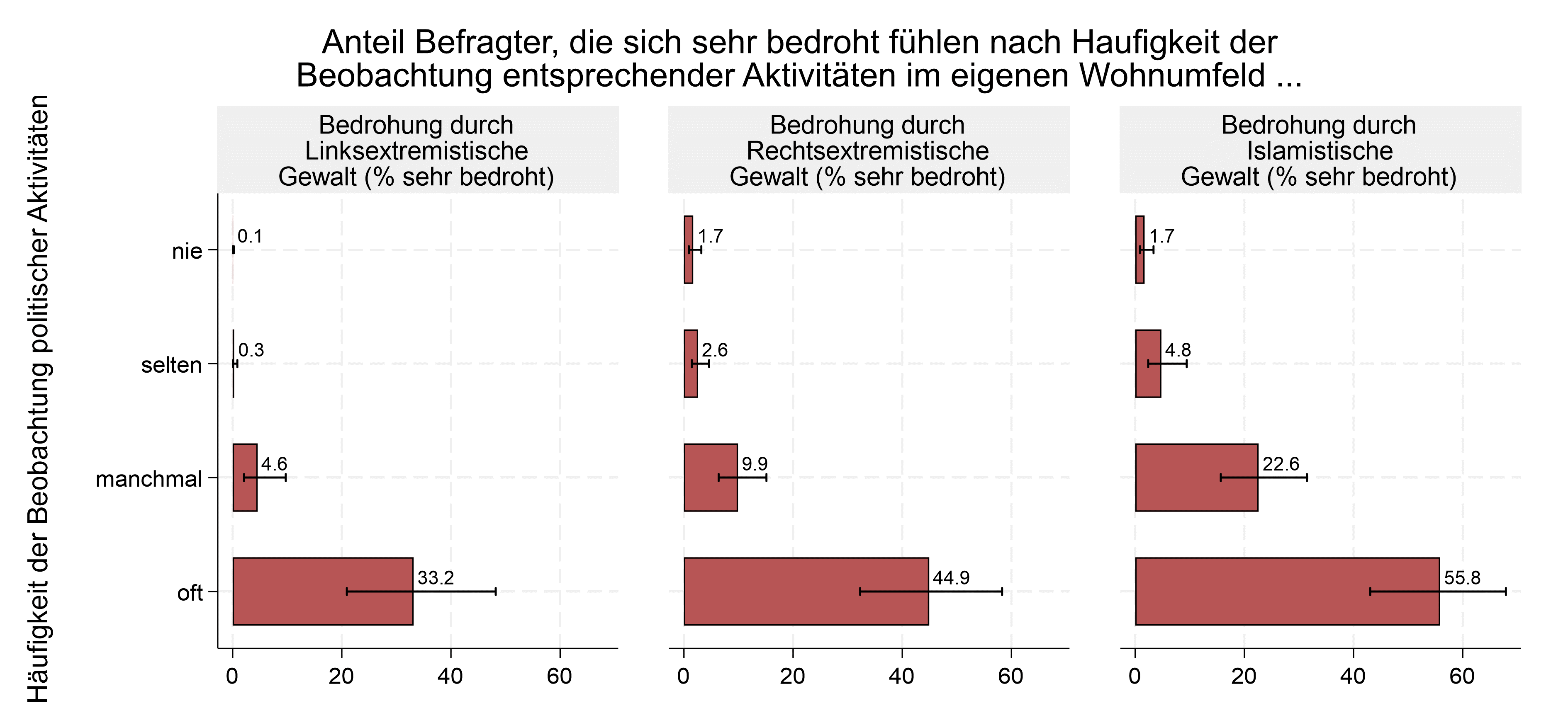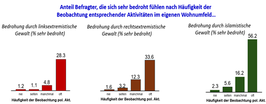 Das hohe Bedrohungspotenzial, welches mit islamistischer politisch motivierter Gewalt assoziiert wird, scheint somit weniger abhängig vom Ausmaß der tatsächlich subjektiv erlebten Konfrontationen mit diesem Phänomen in der eigenen Lebensumgebung zu sein, als das für Rechtsextremismus und Linksextremismus gilt. Weiter gilt, dass Islamismus, auch unabhängig von Grad seiner Wahrnehmung durch Aktivitäten im eigenen Umfeld, generell stärker mit einer Bedrohung durch Gewalt verbunden wird, als dies für Rechts- und Linksextremismus gilt.