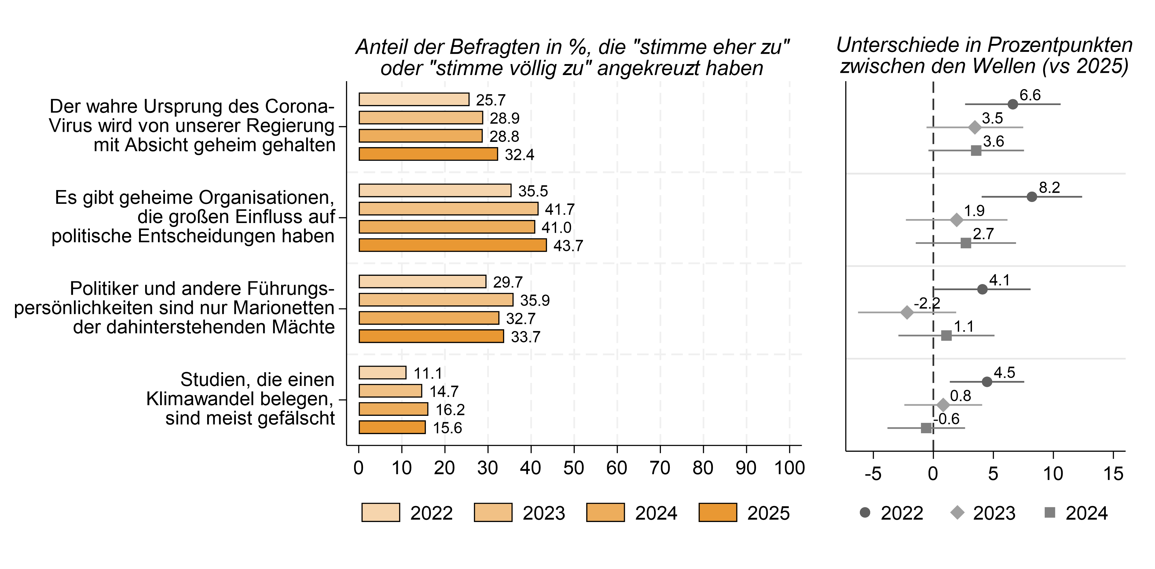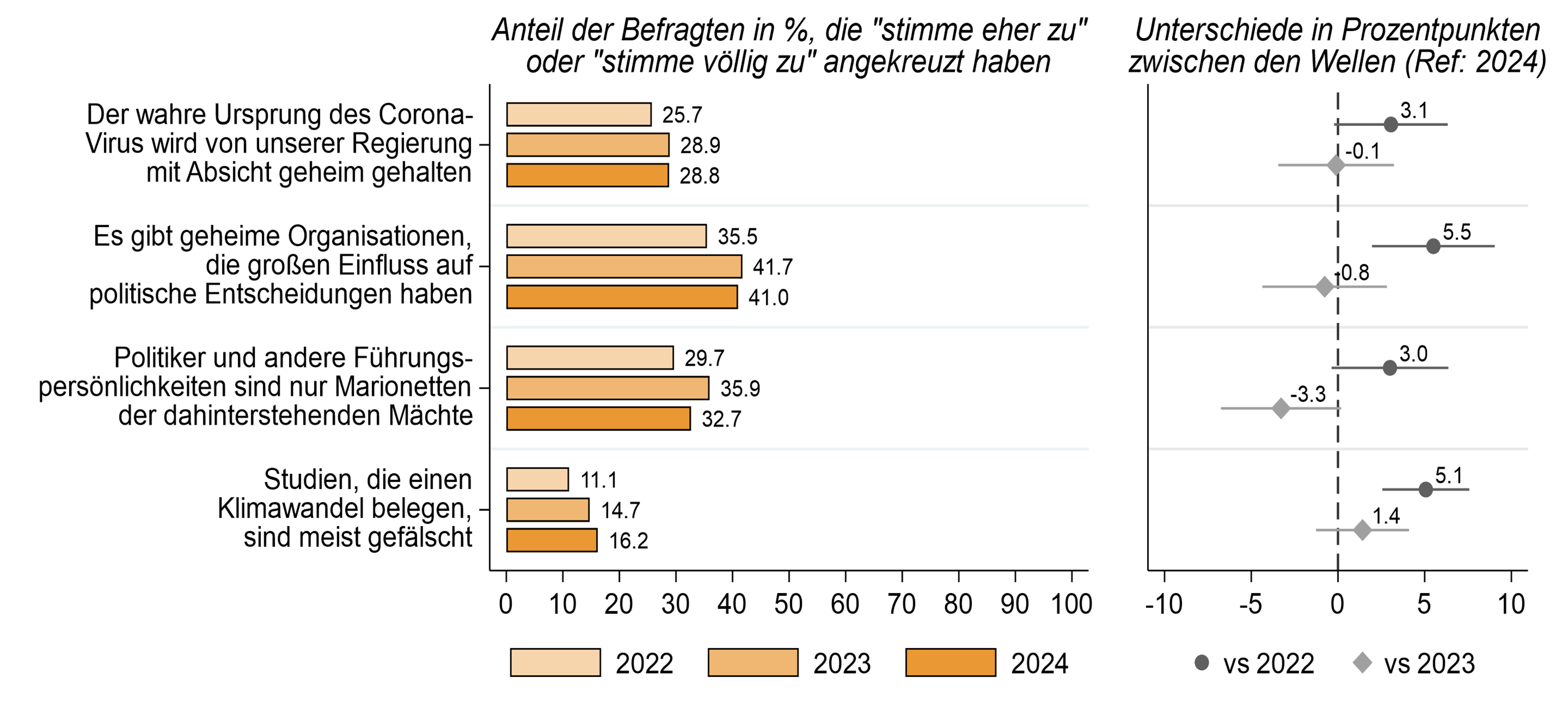 Diese Zustimmungsraten sind seit 2022 deutlich angestiegen. Dies gilt vor allem für die Annahme, dass es geheime Organisationen gibt, die großen Einfluss auf politische Entscheidungen haben (+8.2 Prozentpunkte). Die Rate der, die der Ansicht sind, dass Politiker in Wahrheit nur Marionetten sind, die durch dahinterstehende Mächte gesteuert werden, hat ebenfalls stark zugenommen (+4.1 Prozentpunkte), ebenso die wissenschaftsskeptische Haltung, dass Studien zum Beleg des Klimawandels gefälscht seien (+4.5 Prozentpunkte).