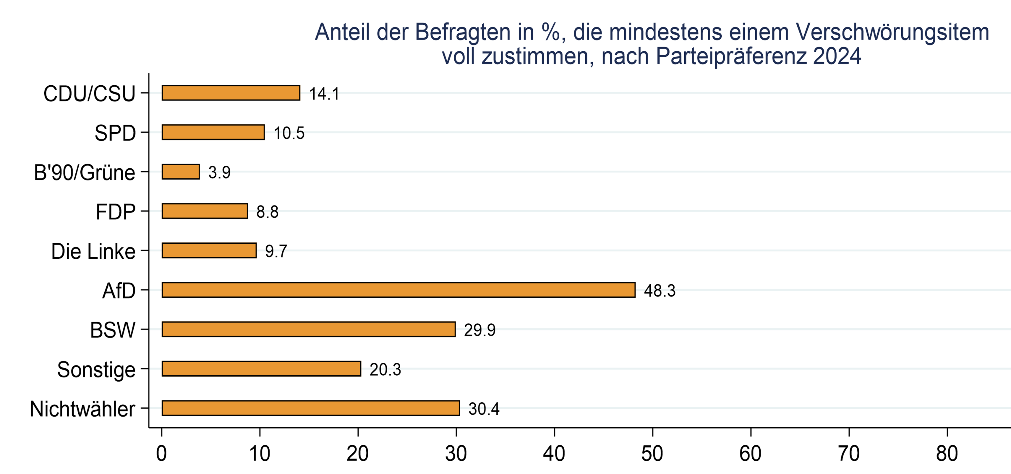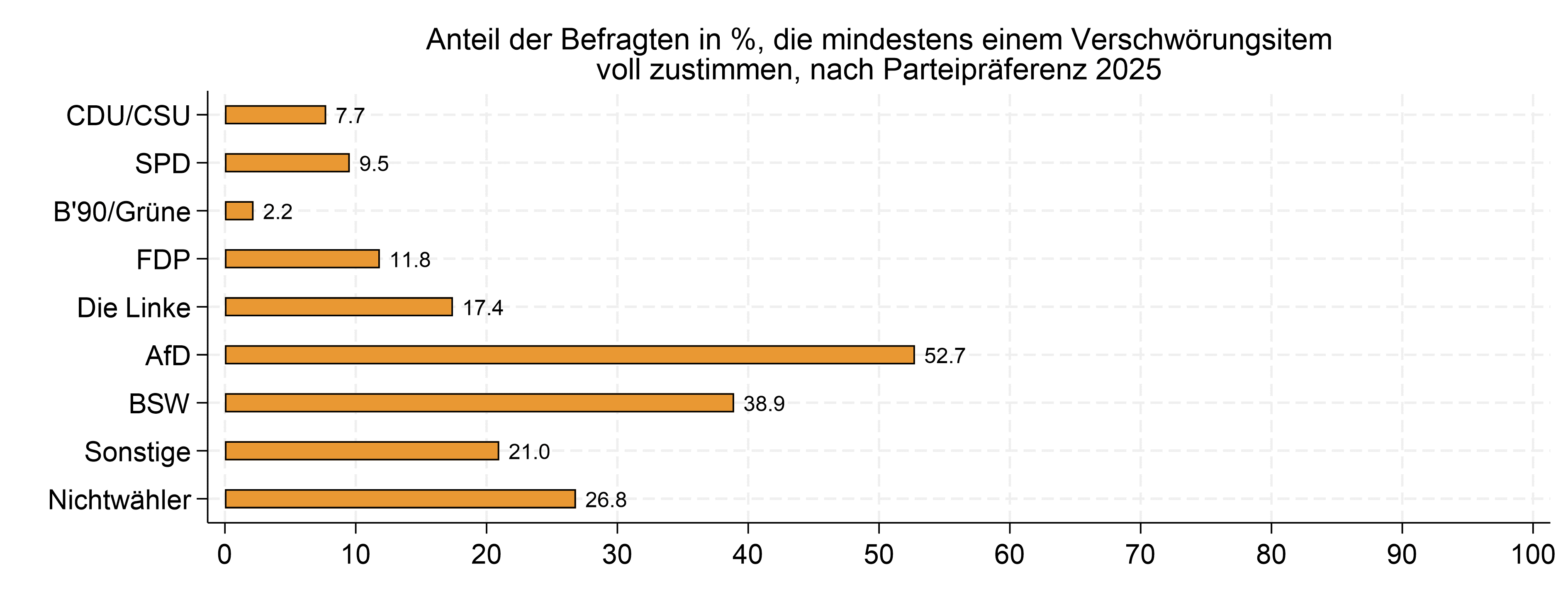Darüber hinaus ist ein beträchtliches Niveau der der Akzeptanz von Verschwörungserzählungen zu erkennen. Diese speisen Misstrauen in staatliche Institutionen und vermehren die Schwierigkeiten, rationale Debatten über gesellschaftliche Probleme und differenzierte Ansätze zu ihrer Lösung angemessen führen zu können. Diese Entwicklungen haben sich 2025 weiter fortgesetzt.