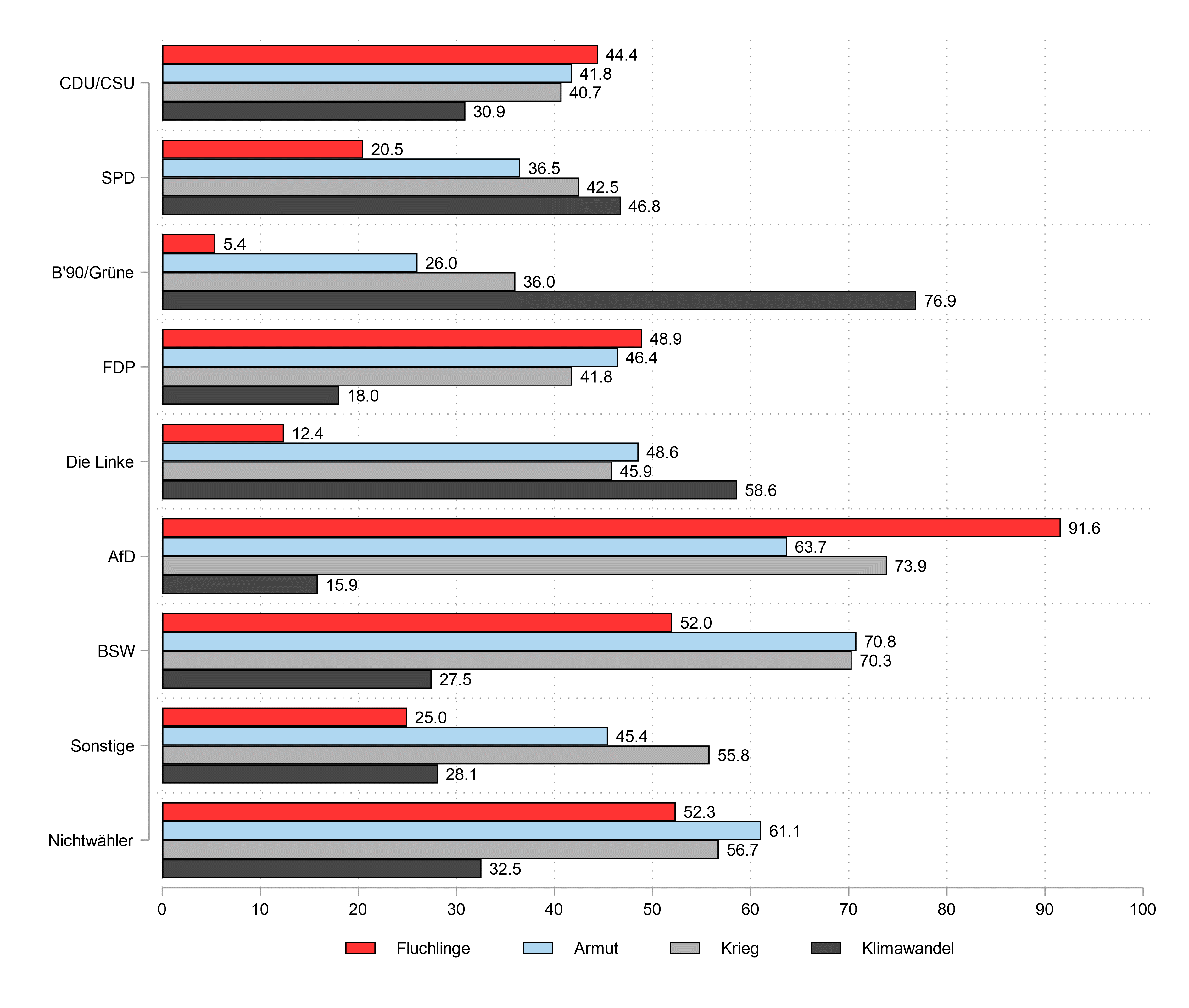 Es findet sich damit ein Gesamtbild, wonach die Wähler*innen der links- sowie rechtsautoritären populistischen Parteien AfD und BSW besonders stark von Sorgen gelenkt werden. Bei der AfD gilt dies vor allem für Sorgen in Bezug auf Flucht/Migration und Armut. Bei der BSW stehen Krieg und Armut im Zentrum.