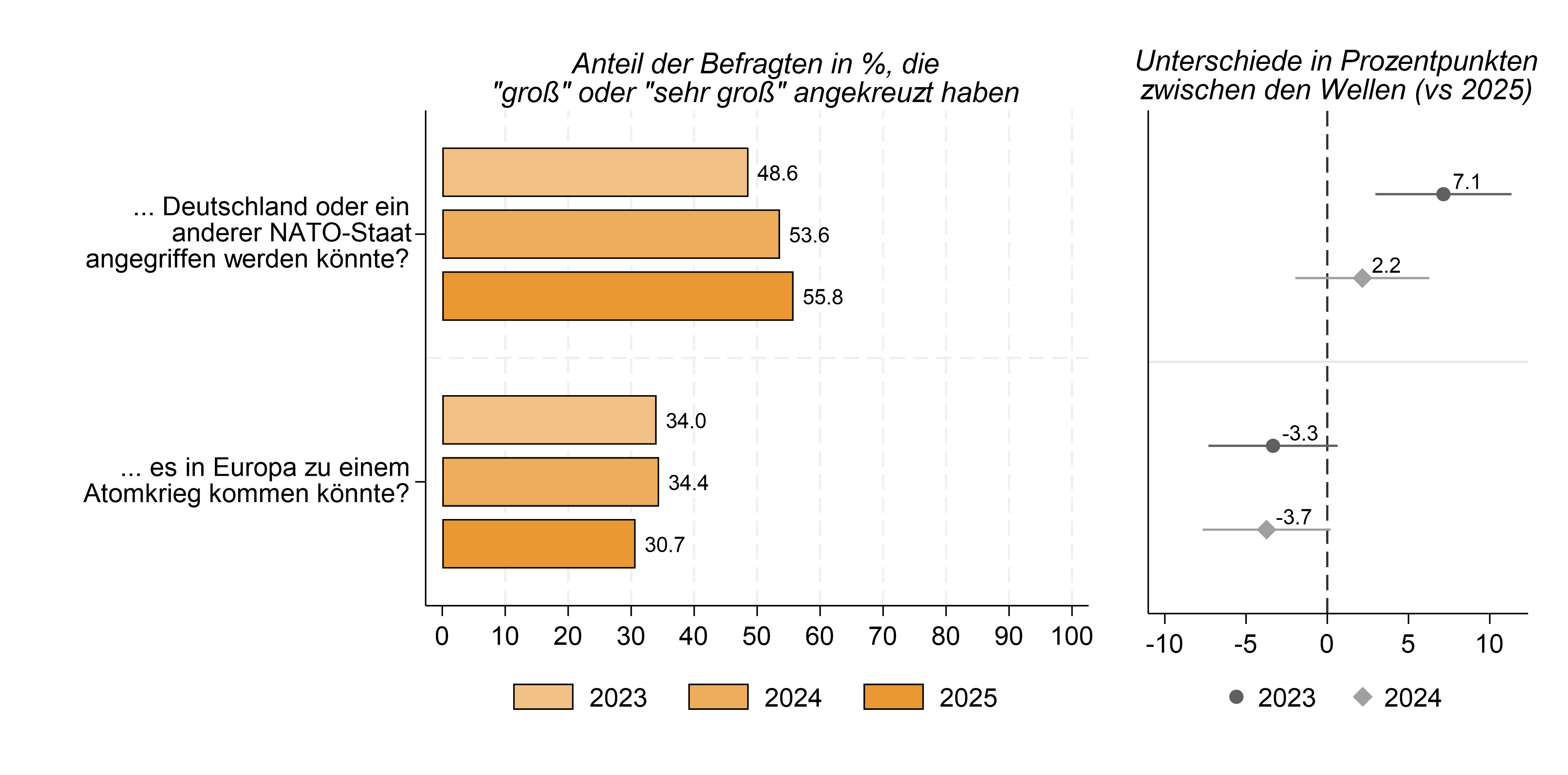 Werden mit Krieg assoziierte Besorgnisse vor dem Hintergrund der Entwicklungen in der Ukraine weiter konkretisiert, dann ist zu erkennen, dass die Sorge, ein NATO-Staat könnte angegriffen werden, im Jahr 2025 im Vergleich zum Jahr 2023 um 7.1 Prozentpunkte zugenommen hat. Sie betrifft mit 55.8% aktuell mehr als die Hälfte der Stichprobe.