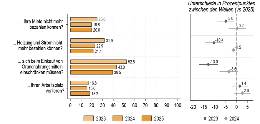 Ein Fünftel (20.0%) hält es für „wahrscheinlich“ bis „sehr wahrscheinlich“, dass sie ihre Miete nicht mehr bezahlen können. Ein ähnlich hoher Anteil (21.4%) glaubt, demnächst sich zukünftig im Alltag sogar beim Einkauf von Grundnahrungsmitteln einschränken müssen. Einen Arbeitsplatzverlust befürchten 18.2%. Dieser Wert hat sich zwischen 2024 und 2025 zwar nur geringfügig verschlechtert, liegt aber angesichts der zentralen Bedeutung der Arbeitsplatzsicherheit sehr wohl auf einem relevant hohen Niveau.
