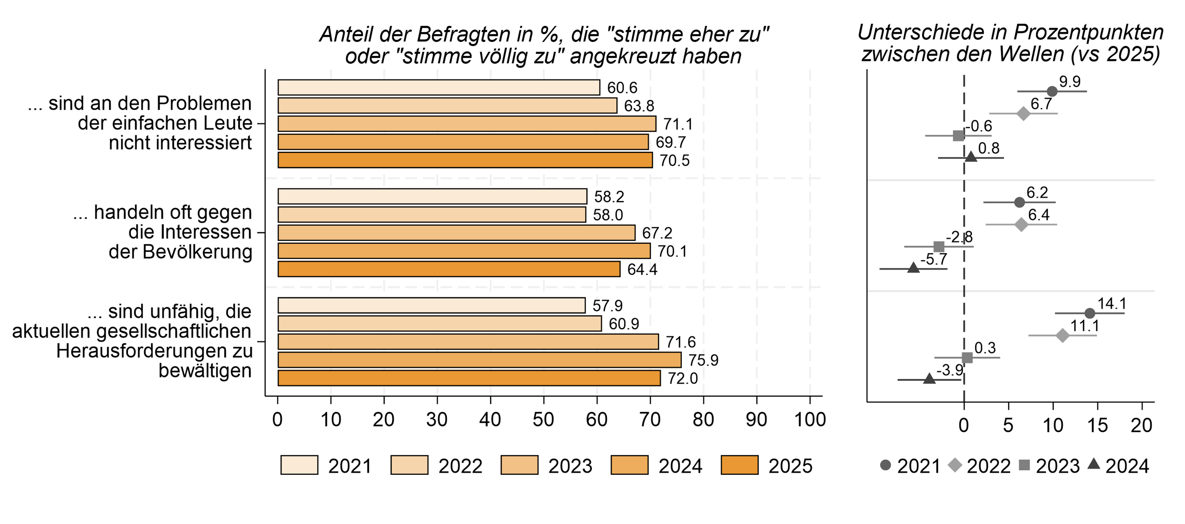 Die Zustimmung zu diesen drei Aussagen ist seit 2021 deutlich um +9.9 (Desinteresse an Problemen der einfachen Leute), +6.3 (Handeln gegen die Interessen der Bürger) bzw. +14.1 Prozentpunkte (Unfähigkeit, die Probleme zu lösen) gewachsen. Zwar finden sich 2025 im Vergleich zum Vorjahr in zwei Bereichen leichte Rückgänge dieser negativen Sicht auf Kompetenzen und Motivation der Eliten bzw. Verantwortlichen in Politik, Wirtschaft und Gesellschaft, diese sind aber nicht signifikant. Eine klare Trendwende ist 2025 nicht zu erkennen.