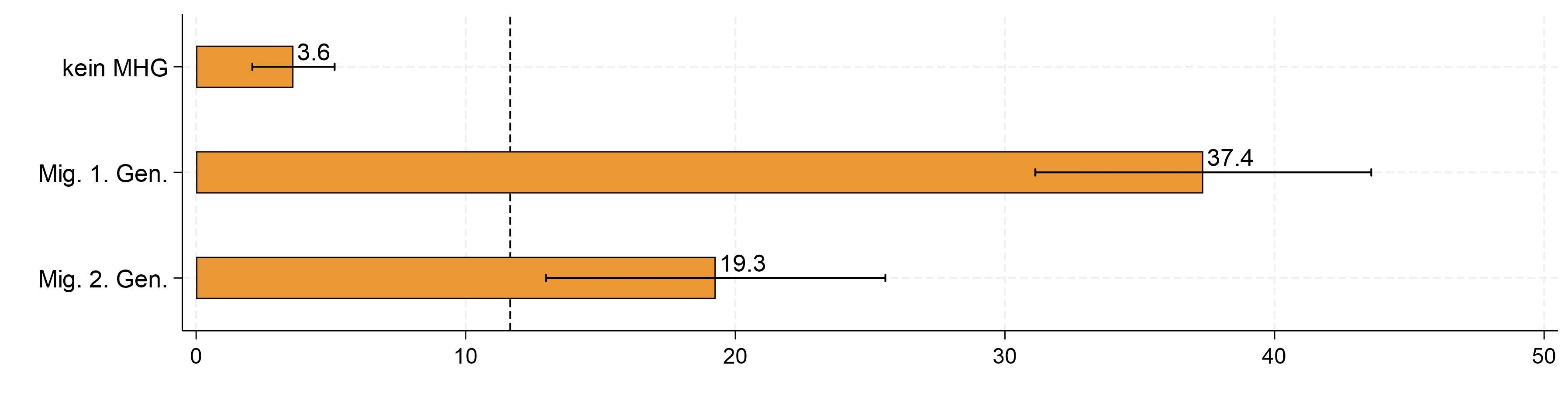 Insbesondere Migrant:innen der ersten Generation berichten zu erheblichen Anteilen über derartige Erlebnisse in Bezug auf die letzten 12 Monate. Mehr als ein Drittel von ihnen (37.4%) wurde mehrfach, d.h. „manchmal“ oder „oft“ diskriminiert. Das ist gegenüber dem Vorjahr 2024 mit einer Rate von 33.1% ein signifikanter Anstieg um 4.3 Prozentpunkte. 19.3% der Migrant:innen der zweiten Generation (d.h. derer, die in Deutschland geboren wurden aber mindestens ein nicht in Deutschland geborenes Elternteil haben), wurden nach eigenen Angaben aus diesem Grund diskriminiert. Von den Personen ohne Migrationshintergrund fühlten sich demgegenüber nur 3.6% in einer solchen Hinsicht betroffen.