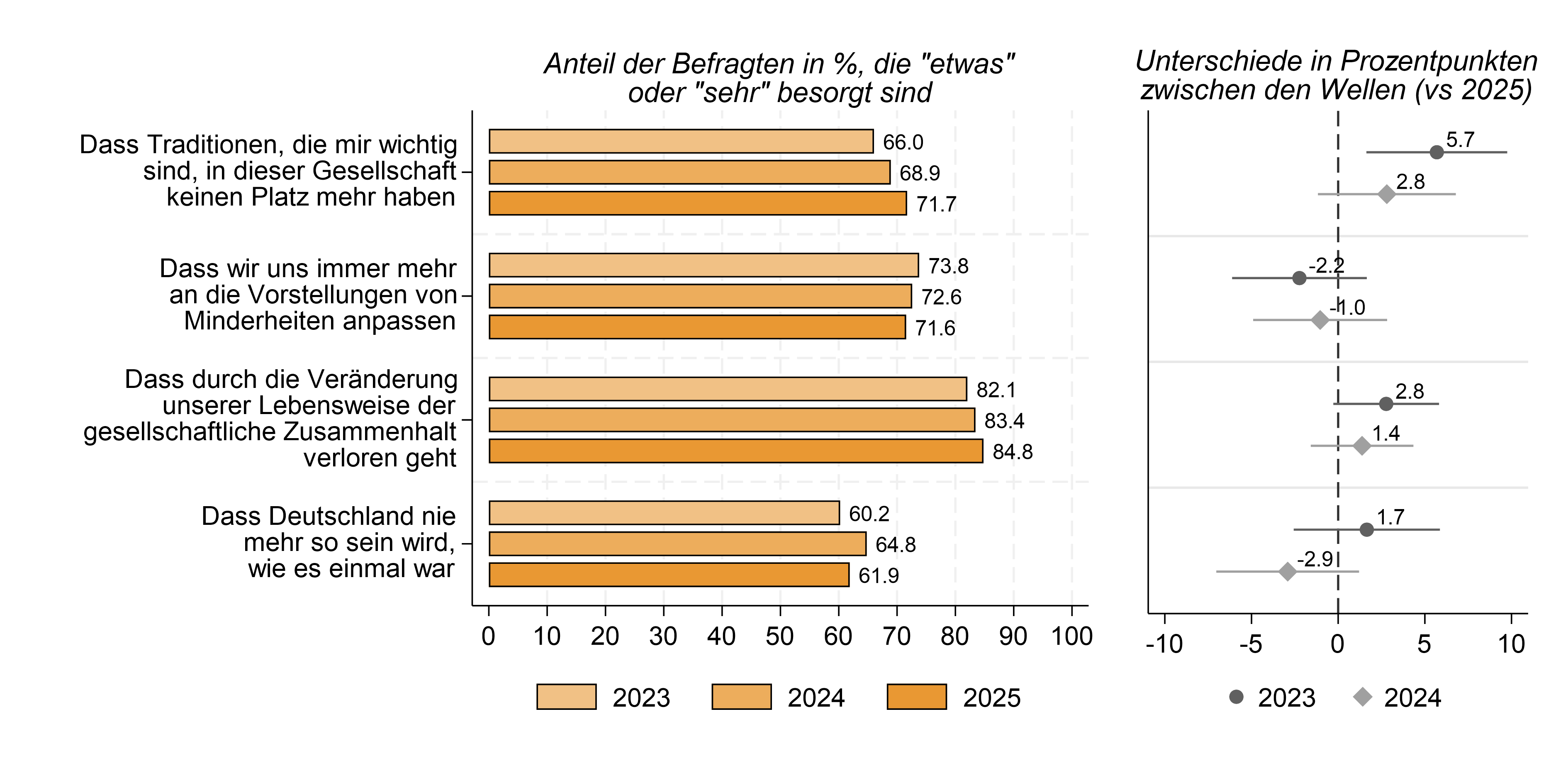 Abbildung 11: Entwicklung von Besorgnissen wegen eines wahrgenommenen sozialen und kulturellen Wandels in Deutschland in % (MiD 2023-2025, gewichtete Daten)