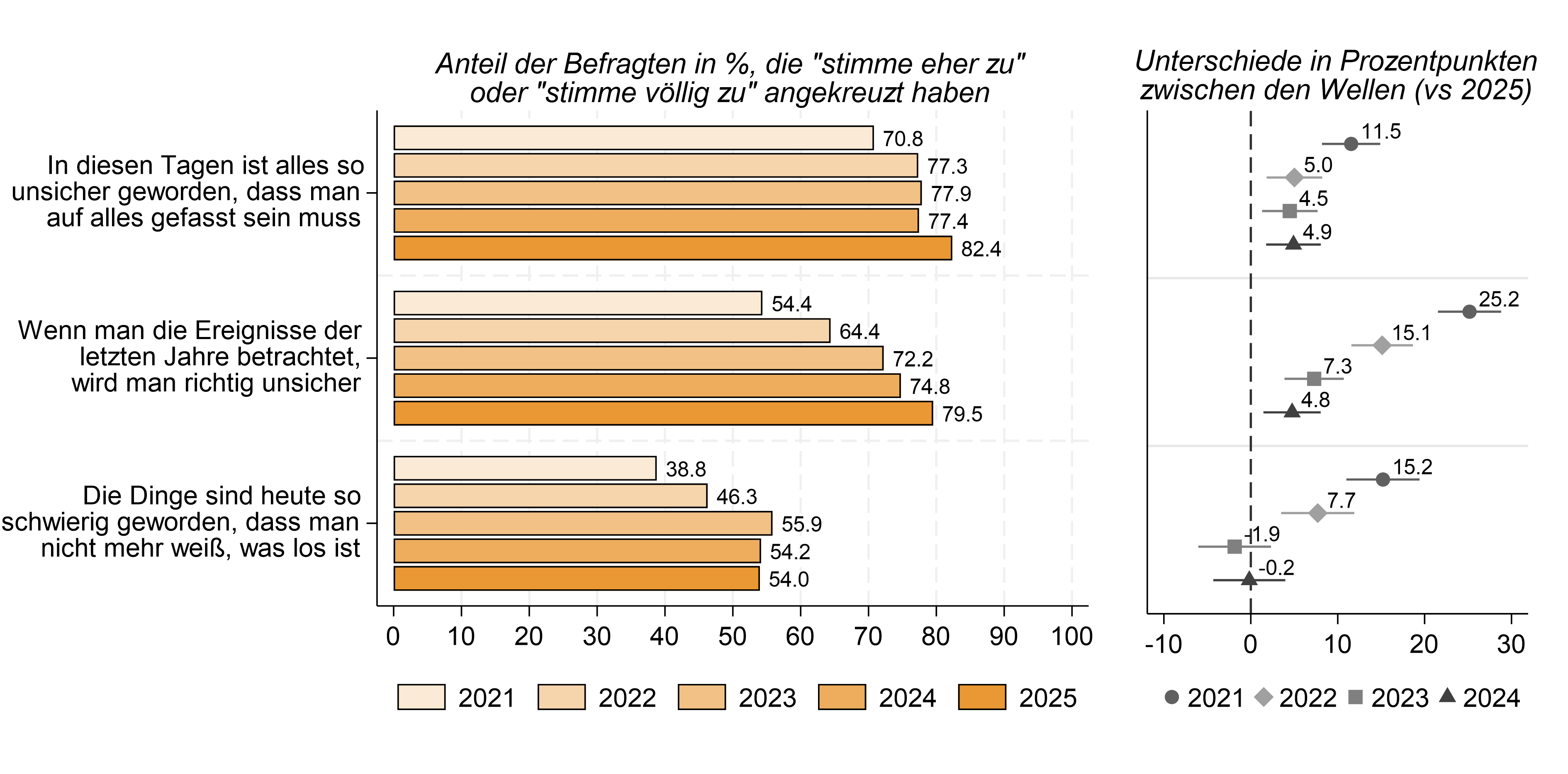 All diese skizzierten Entwicklungen gehen damit einher, dass sich 2025 eine Mehrheit der erwachsenen Bevölkerung in Deutschland, angesichts der Vielzahl der Probleme, Herausforderungen und Veränderungen der letzten Jahre, sowohl im Hinblick auf die gesellschaftliche Situation insgesamt als auch mit Blick auf eigene Perspektiven massiv verunsichert fühlt.